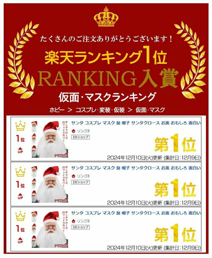 商品詳細 サンタ コスプレ マスク 髭 サンタクロース お面 ひげ サンタコス サンタのヒゲ 仮装 【クリスマスの雰囲気】クリスマスイベントに大活躍!サンタ帽とおひげがついたリアルすぎるサンタさんの仮装マスクです。 【 上質な素材を採用 】上質なラテックス素材を使用したマスクです。立体的で精巧な作りで、ふくふくとしたほっぺやしわなど細かく再現されています。 【 お得な帽子付き 】サンタコスプレには欠かせない三角帽までセットになっています。別売りのコスチュームと合わせれば完璧なサンタクロースになりきれます。 【 様々な場面で大活躍 】イベント、パーティーで大活躍♪本物サンタの登場に子供が大喜び!イベントも盛り上がること間違いなしです。 注意事項 ※商品生地、色合い、コサージュやその他装飾部品の色やデザイン等、生産時期によって、差異が生じます。そのため、同じ商品を複数点ご購入の場合、場合によって色、コサージュのデザイン等差異がでる場合がございます。ご了承ください。