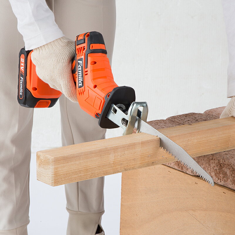 ファミラ 充電式コードレス電動ノコギリ 専用替え刃2枚プレゼント付き 電動ノコギリで作業効率アップ! 枝切り、切断、解体など、様々な作業をこれ1台でスピーディーにこなせるハイパワー電動ノコギリです。15mmのストローク幅と最大3,000回転/分の高速切断で、木材、金属、プラスチックなど、さまざまな素材をスムーズにカット。軽量コンパクトでコードレスだから、場所を選ばずどこでも手軽に使用できます。(本体重量:バッテリー含まず1.1kg) 用途に合わせて選べる2種類のノコ刃が付属。丈夫なマンガン鋼のノコ刃は木材やじゅうたん、ハイカーボン鋼のノコ刃は金属やプラスチックの切断に最適です。工具不要の簡単着脱で、作業に合わせて素早く交換できます。ロック機能付きで誤操作を防ぎ、LEDライト搭載で暗い場所での作業も安心です。約3時間で充電完了、連続使用約20分と、作業効率も抜群。 【こんな方にオススメ】 ・DIY初心者の方 ・庭の手入れをよくする方 ・リノベーションやリフォームをする方 ・コンパクトで使いやすい工具をお探しの方 ★サイズ 約18×奥行8×高さ30cm ★重さ 約1.1kg(バッテリー含まず) ★素材 本体:ABS樹脂、ナイロン樹脂、ノコ刃(木材ジュータン用)マンガン鋼、ノコ刃(金属・プラスチック用)ハイカーボン鋼 ★付属品 本体、マンガン鋼ノコ刃替え刃、ハイカーボン鋼ノコ刃替え刃、ACアダプター、バッテリー、収納ケース ★仕様 電源:AC100V、充電時間:約3時間、連続使用時間:約20分、バッテリー容量:約1,500mAh ★備考 一部組立式 ★製造国 中国製(企画:日本) 【連続使用時間について】 満充電時の稼働時間は無負荷状態で最大約20分、環境や対象物、使い方に左右されますが、作業時は約10分です。 【注意事項】 ※製品を使用する前には取扱説明書を必ずお読みください。 ※意図しない方向に刃が跳ねる可能性を認識して慎重に作業を行ってください。 ※作業は明るく整理整頓された場所で行ってください。 ※作業は適切な服装で行い、防護めがね、防じんマスク、耳栓などの 安全防護具をご使用ください。☆レビュー投稿で特典配布中!☆