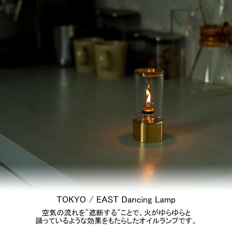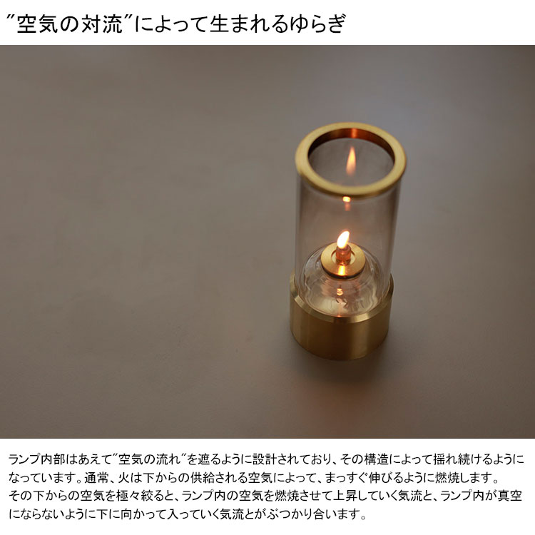 Dancing Lampは空気の流れを遮断することで、火がゆらゆらと踊っているような効果をもたらしたオイルランプです。1/fのゆらぎが心をじんわりと癒してくれることでしょう。この絶妙なゆらぎは東東京の職人の熟練した技術によって生まれています。揺らぎ続ける炎を眺めながら、ぜひ"何もしない"時間を楽しんでみてください。サイズ:本体:約幅5×奥行5×高さ10.8cm素材:真鍮、ガラス、ゴムパッキン、芯オイル:レインボーオイル(パラフィンオイル)をご使用ください。本品には付属しておりません。燃焼時間:タンクを満タンにするとおよそ8時間ほど燃焼してくれます。【注意事項】※本製品は屋内用です。屋外でのご使用は推奨していません。※点灯中は、製品のそばから離れないようにしてください。※点灯中や消灯直後は本体が熱くなっています。手を触れず、また動かさないでください。※製品を倒したり傾けるとオイルが漏れる場合がございますのでご注意ください。※周りに燃えやすいものがない状態で、水平で安全な場所でご使用ください。※製品にはお子様やペットが近づかないようにしてください。 ▼専用オイルも販売しております▼