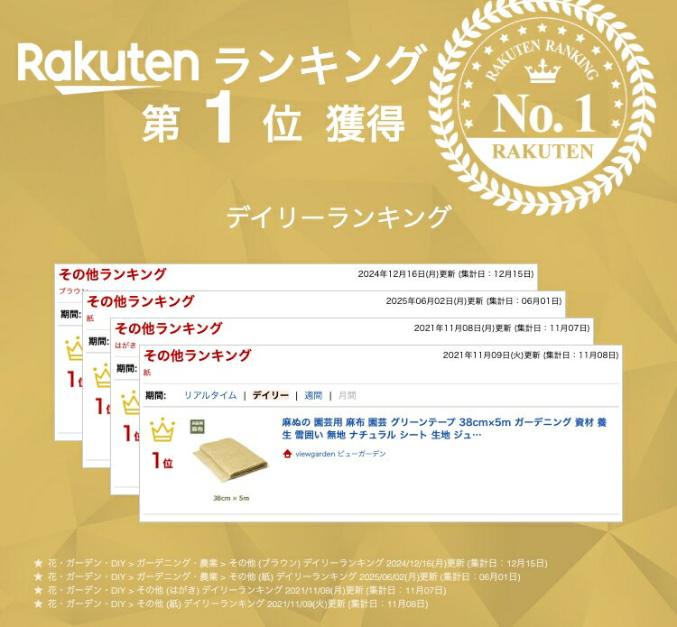 //早いもの勝ち!viewgarden店内全品で使えるクーポン\\ ※14時〜15時の時間帯のご注文は、システムの都合上、当日発送ができない場合がございます。お届け日時の選択で最短お届け日を選択いただいても日付指定が無効となり、ご注文から4日以内の発送となります。 最短日程での配送をご希望の場合、14時より前にご注文確定をお願いいたします。楽天スーパーロジスティクスとのデータ連携仕様の都合となっておりますので何卒ご了承ください。関連商品最大1000円オフクーポン【先着利用】麻ぬの 園芸用 麻布 80cm×...最大1000円オフクーポン【先着利用】麻ぬの 園芸用 麻布 15cm×...最大1000円オフクーポン【先着利用】麻布 ロール 麻 生地 布 ジュ...2,270円920円3,715円最大1000円オフクーポン【先着利用】麻縄 8mm×10m メール便 ...最大1000円オフクーポン【先着利用】麻布 麻 生地 布 ジュート グ...最大1000円オフクーポン【先着利用】麻布 麻 生地 布 ジュート グ...1,142円699円2,190円最大1000円オフクーポン【先着利用】クルミ の殻 300g 約1リッ...最大1000円オフクーポン【先着利用】麻布 ロール 麻 生地 布 ジュ...最大1000円オフクーポン【先着利用】クルミ の殻 14kg 約45リ...1,580円5,900円12,999円最大1000円オフクーポン【先着利用】麻布 麻 生地布 ジュート グリ...最大1000円オフクーポン【先着利用】苔 庭 国産 58×28cm 4...最大1000円オフクーポン【先着利用】植木 麻 ジュート ロープ 麻縄...1,258円17,140円2,980円麻布38cm×5m園芸・造園の現場で使われている、プロユースの麻布です。水はけが良く土を逃がさないので、土もれ防止のためのベースとしても重宝します。材質: 麻100% サイズ: 38cm×5m made in Japan丈夫でリーズナブルなプロユースの天然材料園芸・造園の現場で使われている、プロユースの麻布で、ざっくりした風合いが魅力です。 庭づくりでは樹木の根巻き(掘り起こした樹木の根のまわりを土ごと包むこと)に使います。 天然成分100%で無害。丈夫ですが、埋めれば1年で土に還ります。 水はけが良く土を逃がさないので、ワイヤーバスケット(ハンギング)への寄せ植えなど、土もれ防止のためのベースとしても重宝します。 また、ざっくりした風合いはナチュラルな雰囲気の演出に最適。ディスプレイやラッピング、クラフトなど様々なシーンで活躍できそうです。 ■麻布38cm×5mをお買い上げにあたって ・ざっくりした風合いで出来ているため、織りが均一ではありません。寸法のばらつき、ヨレや色ムラ、ところによって織りの重なりなどがあります。また途中に布の継ぎがあることがありますが、不良品ではございませんので予めご了承ください。 ・商品の糸には加工がしてありませんので、多少の毛羽立ちがあります。 ・同じ商品を数個お求めの際も、単位ごとに切り取らせていただきます。 ・麻布は製造工程上、油を使いますので独特の匂いがあります。ご使用前に一度丸洗いすると、多少匂いをやわらげることができます。■この商品で対応可能なラッピングギフトバッグ※色は選べません\200※上記【ギフトバッグ】以外のラッピングは対応できかねます。※ご購入時の「ラッピング・のし」オプションにて【包装紙とリボン】を選択できますが対応できかねます。また、備考欄で熨斗やメッセージの要望をいただいたとしても対応できかねます。※対応できないラッピングをご希望いただいた場合も、全て【ギフトバッグ】のみのラッピングにて発送させていただきますのでご了承ください。※ラッピング内容について、当店よりEメールにて確認の問い合わせをさせていただく場合がございます。ご注文後は必ずEメールをご確認ください。関連ワード: 麻布38cm×5m / 資材・園芸用品 ViewGardenオリジナル MM38C5 根巻き 幹巻き 雪囲い 養生 ラッピング 庭の道具 ガーデニング雑貨 新生活 春からの庭づくり 母の日 庭を愛するお母さんへ ViewGarden (ビューガーデン) ガーデン資材 敬老の日 お花が好きなご両親へ 共同園芸 ViewGardenオリジナル MM38C5 麻ぬの 園芸用 麻布 園芸 グリーンテープ 38cm×5m ガーデニング 資材 養生 雪囲い 無地 ナチュラル シート 生地 ジュート ディスプレイ ラッピング プレゼント ギフト お祝い お中元 お歳暮 誕生日 誕生祝い 出産祝い 結婚祝い 新築祝い 引越し祝い 入学祝い 卒業祝い 入園祝い 退職祝い 還暦祝い 成人祝い 結婚記念日 七五三 敬老の日 父の日 母の日 クリスマス バレンタイン ホワイトデー 就職祝い 昇進祝い 開店祝い 卒業式 結婚式 子供の日 健康祝い 新規オープン 新年会 送別会 歓迎会 引退祝い 退職祝い 正月 旧正月 ひな祭り 桃の節句 端午の節句 彼岸 お花見 イースター 七夕 お盆 十五夜 月見 夏祭り 秋祭り ハロウィン 感謝祭 手土産 お礼 慰労会 来客 お年始 挨拶回り 友達同士の集まり 家族旅行 企業のイベント 会社のイベント 同窓会 学校行事 地域のイベント 自治体の行事 スポーツ大会 文化祭 花見 納涼祭 盆踊り 花火大会 アウトドア キャンプ ガーデン ホームパーティー 街のイベント 展示会