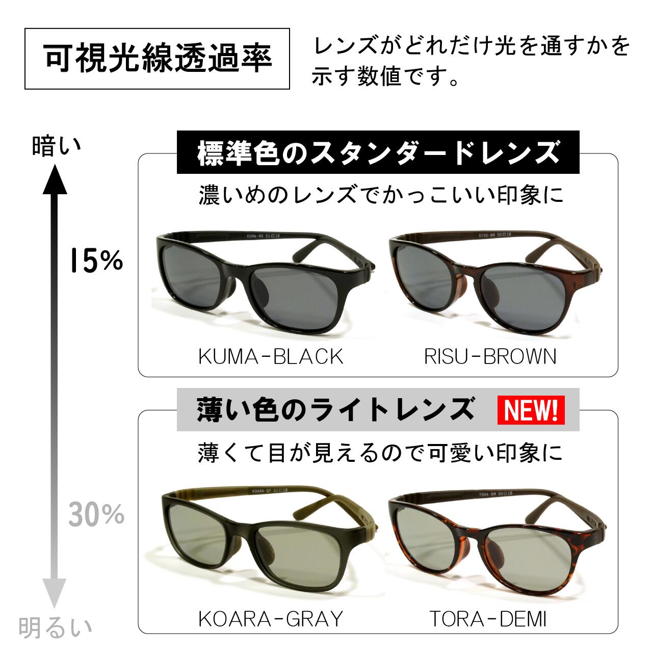 仕 様 カラバリ ・KUMA-BLACK ・RISU-BROWN [2022年度メガネ大賞キッズ部門受賞] ・KOARA-GRAY ・TORA-DEMI ブランド FLOAT KIDS(フロートキッズ) 性別 キッズ(ユニセックス) シェイプ ・ウェリントン…KUMA、KOARA ・ボストン………RISU、TORA 種類 偏光機能付きファッションサングラス 特徴 鯖江企画商品 レンズ枠 プラスチック(TR) テンプル 超軽量弾性樹脂 レンズの種類 プラスチック(TAC偏光) 可視光線透過率 ・KUMA、RISU……15% ・KOARA、TORA…30% 紫外線防止率 UV99%以上カット サイズ ・KUMA、KOARA [ レンズ幅50mm 縦35mm 全幅137mm ] ・RISU、TORA [ レンズ幅49mm 縦38mm 全幅137mm ] 重量 15g 付属品 メガネ拭き兼用ケース(布) 使用方法と取り扱い上の注意 ・テンプルがしっかり結合されていることを確認してからご使用ください。 ・高温のところに置いたり、傷をつけるような金属と一緒にしまわないでください。 ・レンズの濃淡にかかわらず太陽や強い光を直視しないでください。 ・暗い場所や暗い時間帯でのご使用は避けてください。 ・あまり長い時間使用しないでください。 【関連キーワード】 人気 サングラス sunglasses メンズ レディース ユニセックス 男女兼用 男児 女児 男の子 女の子 小顔 女性 メンズサングラス レディースサングラス だて眼鏡 伊達眼鏡 眼鏡 メガネ めがね 黒縁メガネ ファッション ファッションサングラス おしゃれ オシャレ かっこいい モデル アクセサリー ファッションアクセサリー シンプル 定番 ビーチ 海 リゾート 旅行 旅 ストリート 透明 クリア 小さい 小さめ 軽量 持ち運び ケース ケース付き プレゼント クリスマス クリスマスプレゼント 誕生日プレゼント ギフト 贈り物 贈答 贈答品 スポーツ サーフィン サーフ サーファー スノーボード スノボー アウトドア キャンプ 釣り フィッシング 運転 運転用 ドライブ レジャー サイクリング まぶしい 眩しい 日よけ 紫外線カット 紫外線対策 UVカット UV カラーレンズ スモーク スモークレンズ ブラウン ブラウンレンズ グレー グレーレンズ 黒 茶 アジアンフィット アジアンフィッティング 目を保護 花粉 花粉対策 飛沫対策 飛沫 子ども 子供 子供用 小学生 中学生