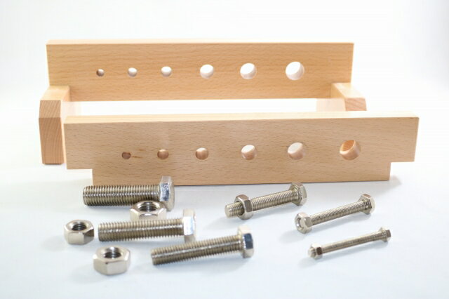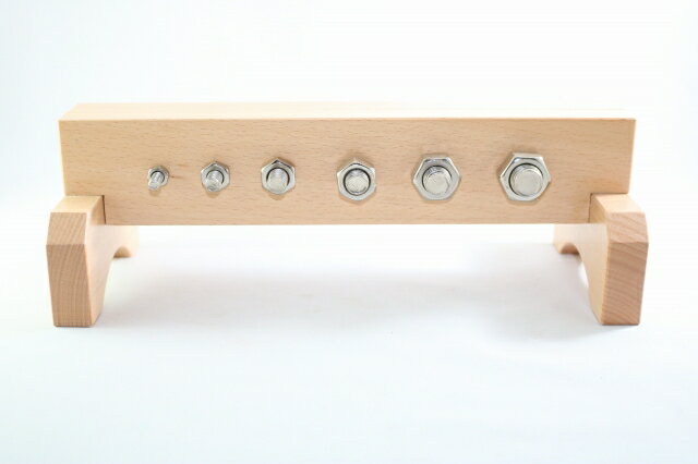 モンテッソーリ ボルトとナット #2 Montessori Nuts and Bolts 知育玩具 感覚教育 Sensorial 日常生活の練習 Practical Life 推奨年齢 2歳ぐらいから 高品質な木製(ビーチウッド)にナットとボルトをはめ、回すと木の板が締まっていきます。それぞれのボルトとナットの太さが異なっていて適切な場所にはめないといけません。ボルトを掴んで回す動作能力を養うと同時にどの場所にあわせるか思考させる優れた教具です。 大きさ: 29 x 12 x 9.7 cm ** 細かなモノや角があるものもありますので、3歳以下のお子様に与える際はご注意くださいませ。親の見守る前で遊ばせるようにしてください。誤飲やケガなどの責任は当店は負えません。免責にご同意いただいたうえでご購入お願い申し上げます。ゆうパックでの発送です。