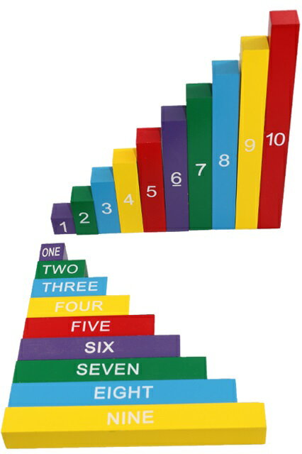 モンテッソーリ 数字・英語の数棒 Montessori Numerical Rods 知育玩具 算数教育 Mathematics 推奨年齢 3歳ぐらいから 5色の棒それぞれ数字と英語の表記があります。5+5=10、2+8=10、4+6=10などが、実際に手にしたり、視覚的に訴えることで容易に理解できます。 木製。木製ケースもついています。 10の棒: 20 cm x 2 cm x 2 cm (1から10まで2cmづつ長くなります。) ** 細かなモノや角があるものもありますので、3歳以下のお子様に与える際はご注意くださいませ。親の見守る前で遊ばせるようにしてください。誤飲やケガなどの責任は当店は負えません。免責にご同意いただいたうえでご購入お願い申し上げます。クリックポストでの発送です。
