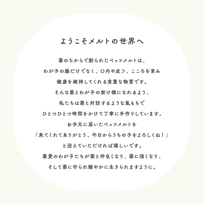 ペッツメルトがリニューアルしました! スプレーノズルと、ワンタッチキャップから選べます。 ペットの乳酸菌生産物質「ペッツメルト」は100%天然自然で無添加、アレルゲンフリーです。 ほんのすこしだけ酸味があります。 ごはんにかけるのが心配なママは、まず、手のひらにかけて 舐めさせてあげてください。はじめはスンスンしていますが、 すぐに美味しそうに舐めてくれます。 そのうち、『メルトはかけた?』みたいな顔をしてママを見るようになります。 【 与え方、摂取の目安 】 毎回のご飯、飲み水、おやつなどにスプレーして与えてください。 以下の目安を参考にして下さい。 (一回あたりのスプレー目安) ◆5キロ未満→2〜3回 ◆10キロ未満→3〜6回 ◆15キロ未満→5〜8回 ペッツメルトジェルとセットでお使いいただくのがおすすめです。 ※ペッツメルトは、化学物質添加や処理を一切行っておらず、 温度や湿度・様々な環境下で起こる醗酵を完全に防ぐことが難しい商品です。 商品到着時、著しく漏れている場合はメーカーにご連絡ください。 代替品との交換対応をさせて頂きます。 (カーラ・ラボ:TEL:089-904-5972) 名称 犬猫用乳酸菌生産物質 内容量 52mL 原材料 複合乳酸源(国産)、黒糖・海塩 保存方法 直射日光・高温多湿を避けて保存。開封後は冷蔵庫保管がおすすめです。 賞味期限 製造日より2年間。開封後は6ヶ月以内を目処にお早めにお使いください。 販売元 一般社団法人 カーラ・ラボ(TEL:089-904-5972) 栄養成分(100gあたり) 熱量 タンパク質 脂質 炭水化物 食塩相当量 1Kcal 0g 0g 0.3g 0.1g 《 関連商品 》 ペッツメルトジェル 48g ペッツメルト 52mL (スプレータイプ or ワンタッチキャップ) ペッツメルト つけカルパウダー 25g 乳酸菌生産物質 KSメルト 500mL 乳酸菌生産物質 KSメルト 1L 乳酸菌生産物質 KSメルト 2L クリスマス島の海の塩 粉末 180g BNペット 55g