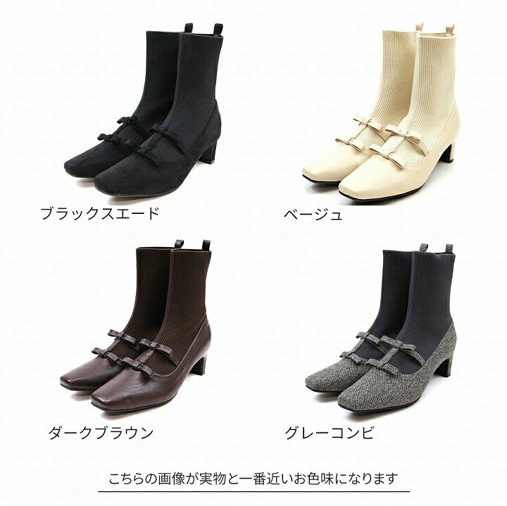 【予約】25年秋冬新作 VIVIAN ヴィヴィアン リボン ブーツ レディース ニットブーツ ソックスブーツ ショートブーツ 5cm プレートヒール スクエアトゥ ブラック 黒 ブラウン グレー ツイード V7380AW