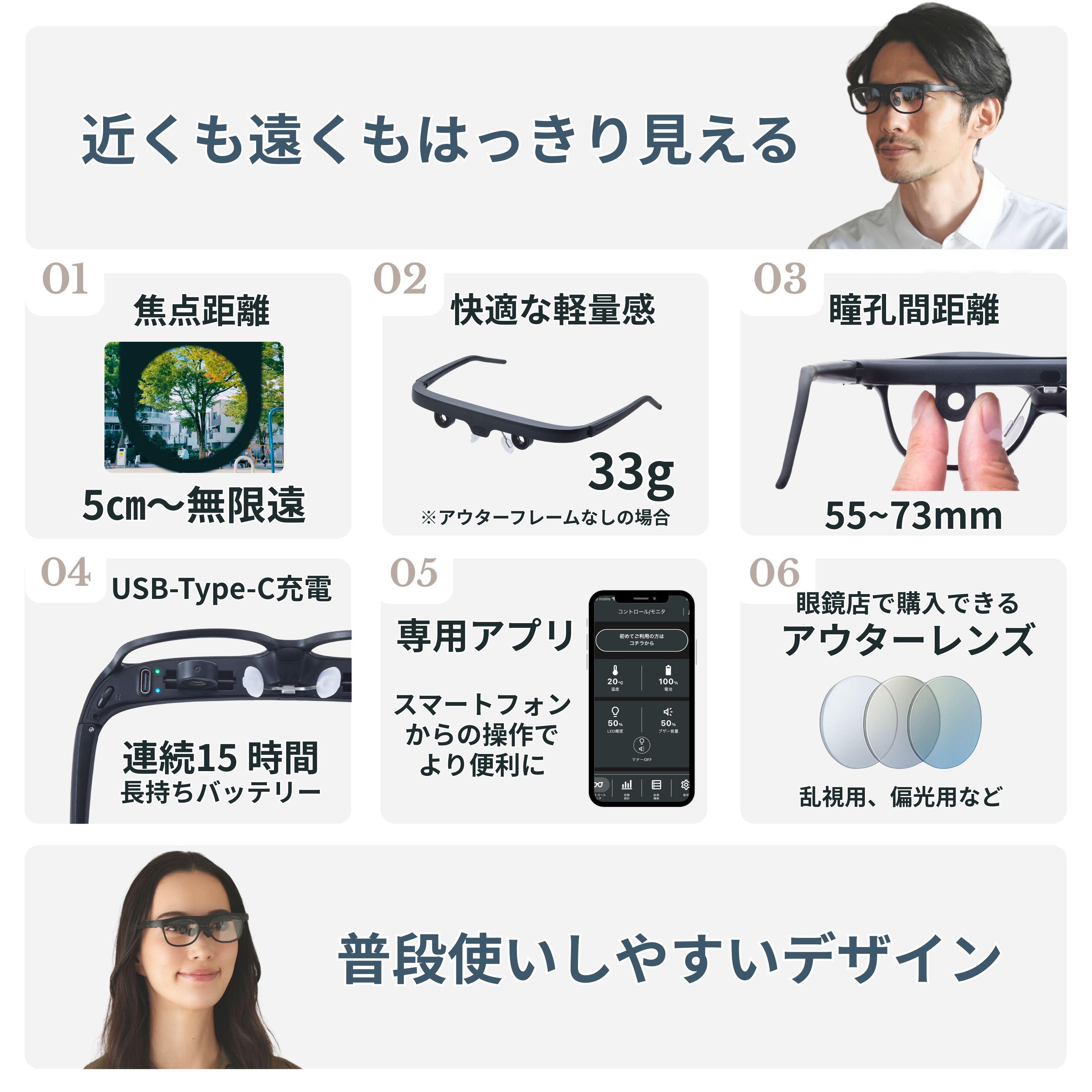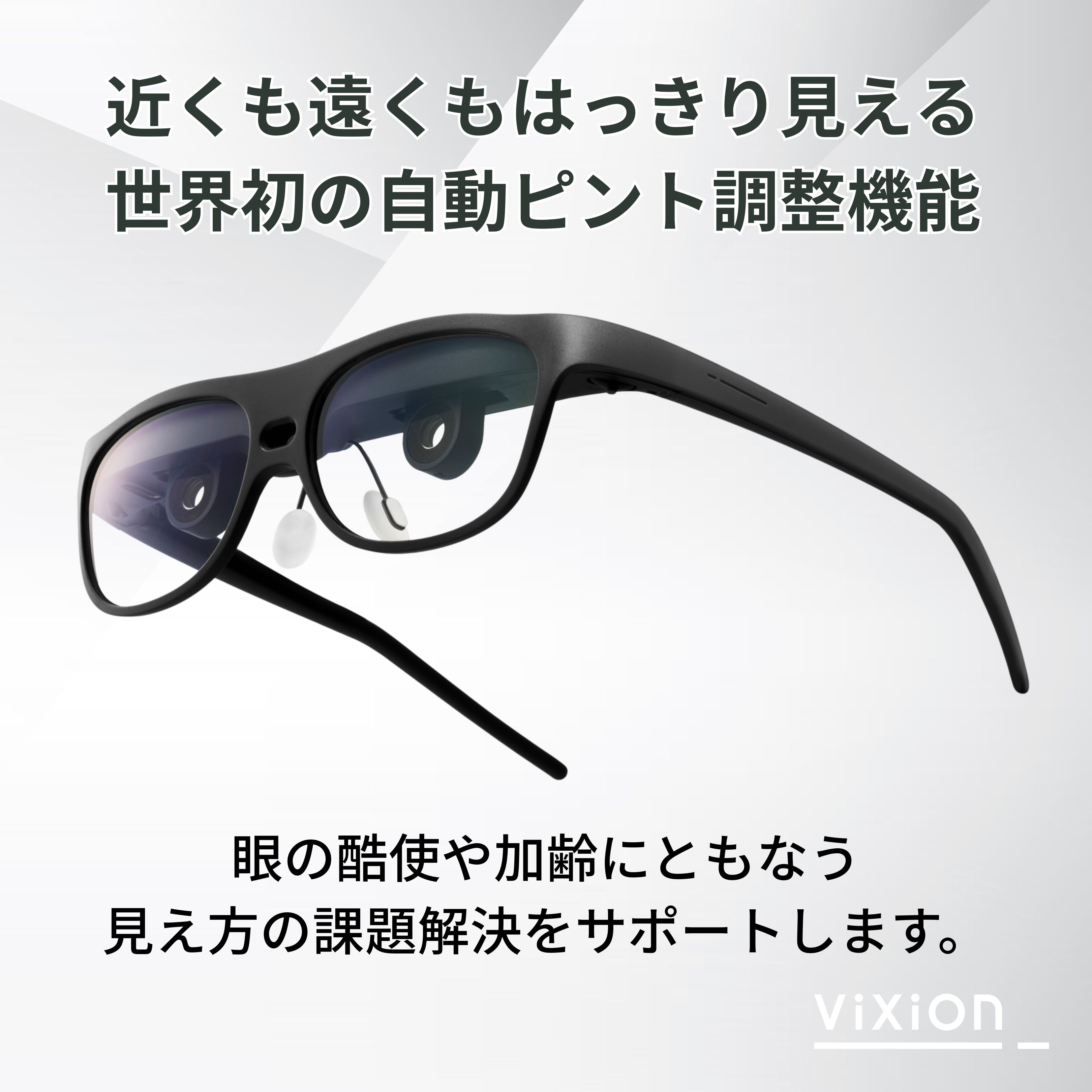 【新モデル!オートフォーカスアイウェア ViXion01S】 ViXion01Sは、「“みえる”を引き出す、夢中がつづく」自動でピントを調節するオートフォーカスアイウェアのスタンダードモデルです。近くも遠くも瞬時に焦点が合い、眼の酷使や加齢にともなう見え方の課題解決をサポートします。 見たい距離にピントが合う!オートフォーカス搭載 見たい対象の距離に応じて、ピントを自動で調節します。 新聞やスマートフォン、テレビ、風景など、視線を向けるだけでレンズが瞬時に反応。両手がふさがっている場面でも、顔を向けるだけでラクに見えるため、作業中や外出先でも快適です。 レンズを自由にカスタマイズ 「乱視対応レンズ」「偏光レンズ」「ブルーライトカット」など、お好みや使用シーンに合わせてレンズをカスタマイズ可能。ご自身の目の状態や用途に合わせて、最適な見え方を実現します。 軽量で快適な装着感 従来モデルから約40%の軽量化を実現。 一般的なメガネとほぼ変わらない重さで、長時間の使用でも耳や鼻への負担が少ない設計です。ビジネスにもプライベートにもなじむ、シンプルで使いやすいデザインです。 長持ちバッテリー&安心の操作音 連続使用は最大約15時間!外出先や長時間の作業でも安心です。 操作はシンプルかつ直感的で、操作時には音でお知らせする機能も搭載。動作状況を確認しやすくなっています。 専用アプリでさらに便利に 専用アプリ「ViXion Connect」では、ピント調節や動作モードの切替、バッテリー残量の確認などが可能。さらに快適な使用体験を提供します。 ■1年間の製品保証付き 本製品は、お買い上げ日から1年以内かつユーザー登録されている方に対し、保証規定に基づき無償修理サービスを提供しております。 ※見え方には個人差があります。 ※本製品は、医薬品医療機器等法における医療機器ではありません。 【製品仕様】 商品名:オートフォーカスアイウェア ViXion01S サイズ:152mm(幅)×160mm(奥行き)×45mm(高さ) 質量:アウターフレームなし:33g / アウターフレーム(ダミーレンズ付き)含む:47g 瞳孔間距離:55mm〜73mm 焦点距離:5cm ~ 無限遠 電気定格:3.7V リチウムポリマー、150mAh / 最大平均電流:10mA / IEC62133-2 認証取得済 充電方式:USB-Type-C充電コード 5V、1A 充電時間:約3時間 連続使用時間:最大約15時間 Bluetooth:Bluetooth 5.4 搭載 ※仕様は暫定であり、予告なく変更となる可能性があります。