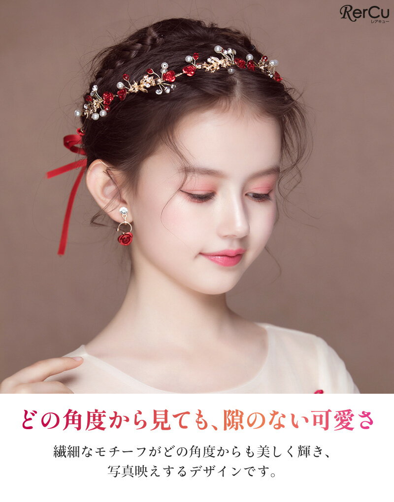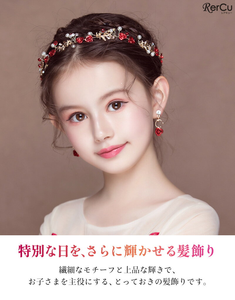 ドレス ヘッドドレス イヤリング セット 女の子 キッズ ヘアアクセサリー 髪飾り 花かんむり 赤バラ パール ゴールド 華やか 上品 キラキラ 発表会 結婚式 卒園式 入学式 卒業式 七五三 パーティー 誕生日 写真撮影 記念日 ドレスアップ 幼稚園 小学生