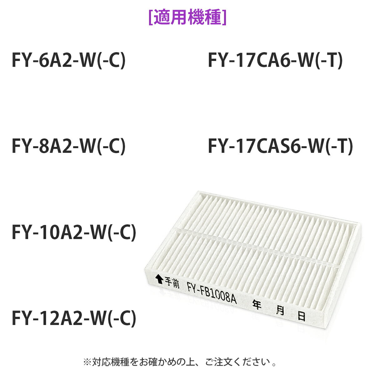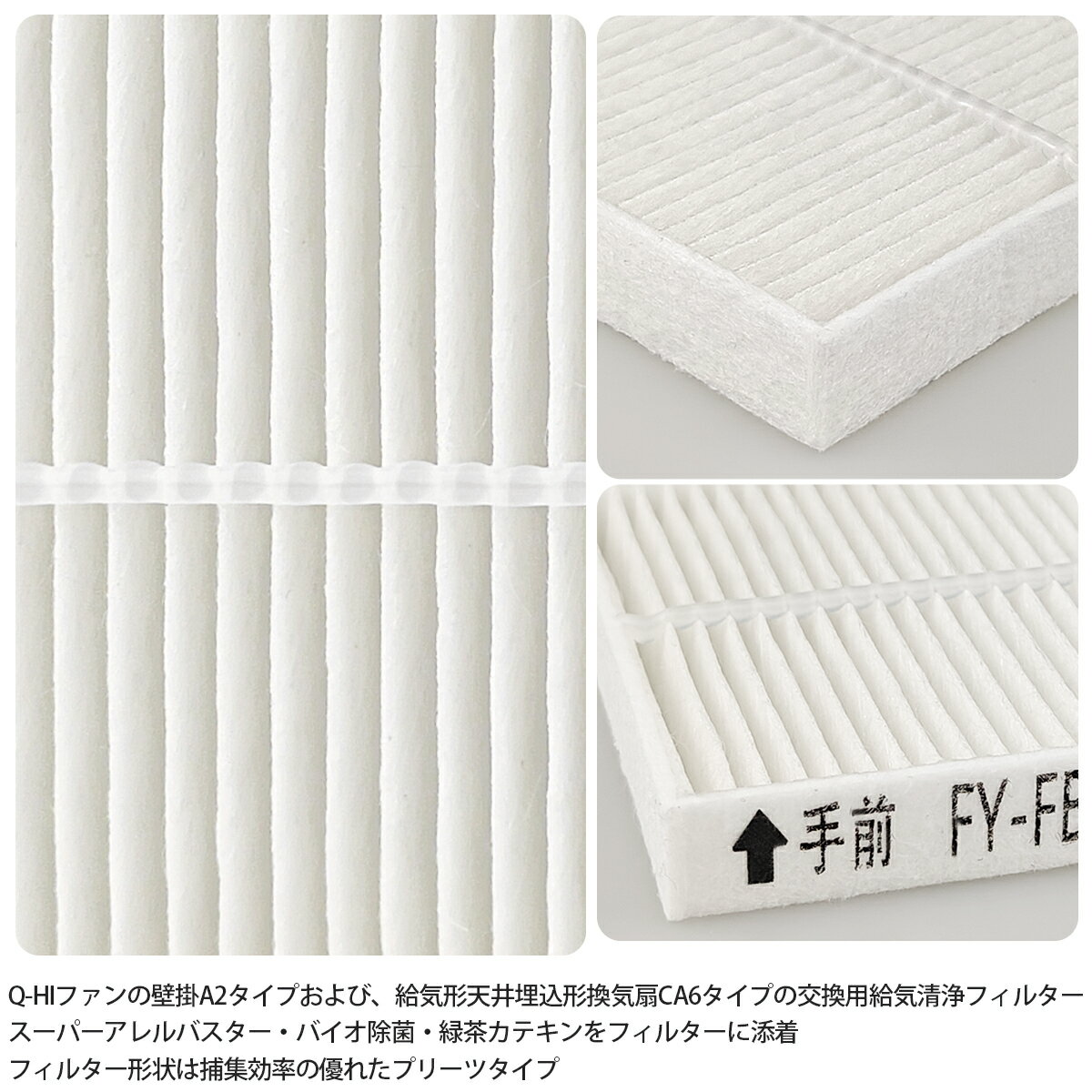 商品の説明: ●Q-hiファンの壁掛A2タイプおよび、給気形天井埋込形換気扇CA6タイプの交換用給気清浄 ●スーパーアレルバスター・バイオ除菌・緑茶カテキンをフィルターに添着 ●フィルター形状は捕集効率の優れたプリーツタイプ ●適用機種:FY-6A2-W(-C)、FY-8A2-W(-C)、FY-10A2-W(-C)、FY-12A2-W(-C)、FY-17CA6-W(-T)、FY-17CAS6-W(-T) ※ご購入の前にご希望商品の対応機種一覧より、適合商品である事をご確認願います。 ※購入検討商品に関してご不明な点やご不安をお持ちのお客様は、ご購入前にお問い合わせください。 注意事項: ・水洗いはしないでください。 ・給気清浄フィルターのお手入れの際は、フィルターを変形させないよう注意してください。 ・給気清浄フィルター性能が損なわれ、室内の壁が汚れるおそれがある。 ・使用済みのフィルターは、お住まいの地域の処理方法にしたがって廃棄してください。 ================================================= 注意事項:お使いのモニターの発色具合によって、 実際のものと色が異なる場合がございます。 =================================================