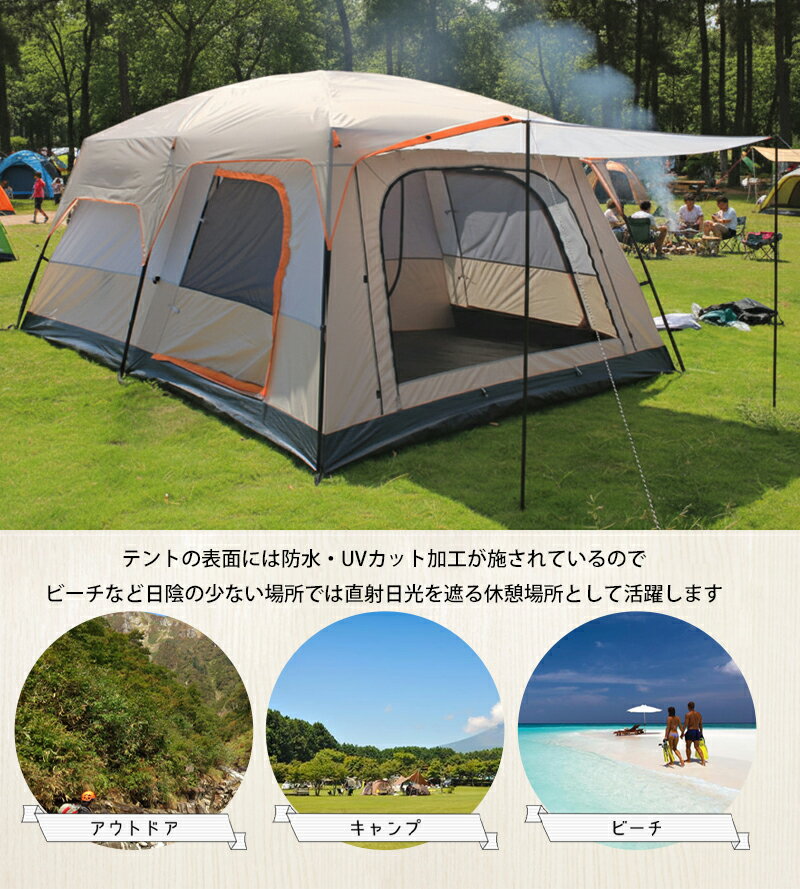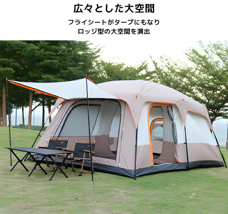 フライシート付きフルークローズ可能、プライバシー保護で就寝中安心です。 開放感よい前室を設け、直射日光を遮断しながら、家族とのくつろげる空間として活用できます。 正面と左右側出入り口にメッシュ面付き、出入り楽々ながら、真夏に風通し良くて涼しいです。 グループやファミリーにおすすめの一台です。 広々としたリビングスペースにはチェアやテーブルなどを配置できます! テント内にはスマホやペットボトル等が収納できる、収納ポケットがついています 突然の雨でも安心。耐水圧分3000mmの 防水加工が施されており 多少の雨でも安心してご使用いただけます。 持ち運びや収納に便利な専用バッグ付き。 【商品仕様】 カラー:ベージュ×ライトブルー×オレンジ 持ち運び用バッグカラー:グレー 全体サイズ(約):横320cm×高さ:180cm×奥行き320cm 収納時サイズ(約):横55cm×高さ23cm×奥行き21cm 定員:7人(1部屋4人:3人) テント素材:210D 重量:9.4kg 【商品内容】 ・本体 ・持ち運び用バッグ ・固定具(袋、ペグ、ロープ) ※簡易英文説明書付き ※ハンマーは付属しておりません。 ※本製品は撥水加工を施しておりますが、雨量によっては浸水することがあります。 大雨、豪雨など、雨量が多い時のご使用はお控えください。 ※広げる時は周りに人がいないことや障害物のないことを確かめて広い場所で広げてください。 注意事項 ・海外製品のため、商品に多少のキズや布地に擦れ汚れ、糸のほつれ・糸くずなどがある場合がございます。ご了承ください ・入荷時期により仕様変更等がある場合がございますのでご理解の方宜しくお願いします。 ・販売専門になりますので、設置のサポートは行っておりません。 ・商品は、モニターによって色合いが異なって見える場合があります。