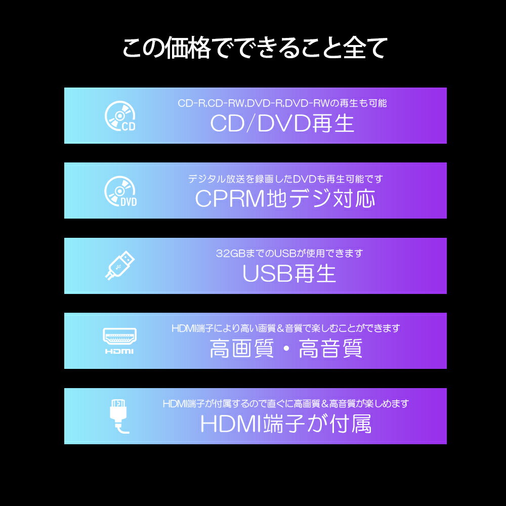 ・沖縄県への発送は別途送料がかかります。 ご注文時に送料無料の場合でも、当社での受注確認の際に別途送料に関するご連絡をさせていただきます。 予めご了承くださいませ。 【製品の特徴】 ●DVDの映像・音声を高画質・高音質で楽しめる ●コンパクトで持ち運びラクラク! ●CPRM再生可能 ●HDMI端子、HDMIケーブル付属 【仕様】 ■外形寸法:幅223×高さ42×奥行188mm(突起物含まず) ■重量:約683g ■再生可能メディア:DVD/CD/CD-R(RW)DVD-R(RW)/USBメモリー(32GBまで) ■再生可能ファイル形式 動画ファイル形式:AVI 動画フレームレート:15/秒 動画ピクセル:720×576(かそれ以下) 音楽ファイル形式:MP3 写真ファイル形式:JPEG ■出力端子:HDMI/AV ■入力端子:USBメモリー ■電源:AC100V 50/60Hz ■信号形式:NTSC ■リージョンコード:2 ■付属品:AV接続ケーブル(約94cm)、HDMIケーブル(約144cm)、ワイヤレスリモコン(動作確認用電池入)、取扱説明書、保証書 【注意事項】 ※USBでのご使用はAVIのファイル形式に対応しております。 ※CPRMはVRモードに対応しております。 ※HDMIケーブルと赤白黄のAVケーブルの2種類が付属しております。 どちらか一方をプレーヤー本体とテレビに接続してください。 テレビ側にHDMI入力端子か赤白黄のAV入力端子があるかをご確認ください。 [関連キーワード] 楽天1位 DVDプレーヤー 再生専用 HDIM AVケーブル付き コンパクト テレビ用 かんたん 接続 高画質 高音質 CPRM 地デジ対応 据え置き USB 安心の1年保証 DVD-V019 VERTEX ヴァーテックス[関連キーワード] 楽天1位 DVDプレーヤー 再生専用 HDIM AVケーブル付き コンパクト テレビ用 かんたん 接続 高画質 高音質 CPRM 地デジ対応 据え置き USB 安心の1年保証 DVD-V019 VERTEX ヴァーテックス