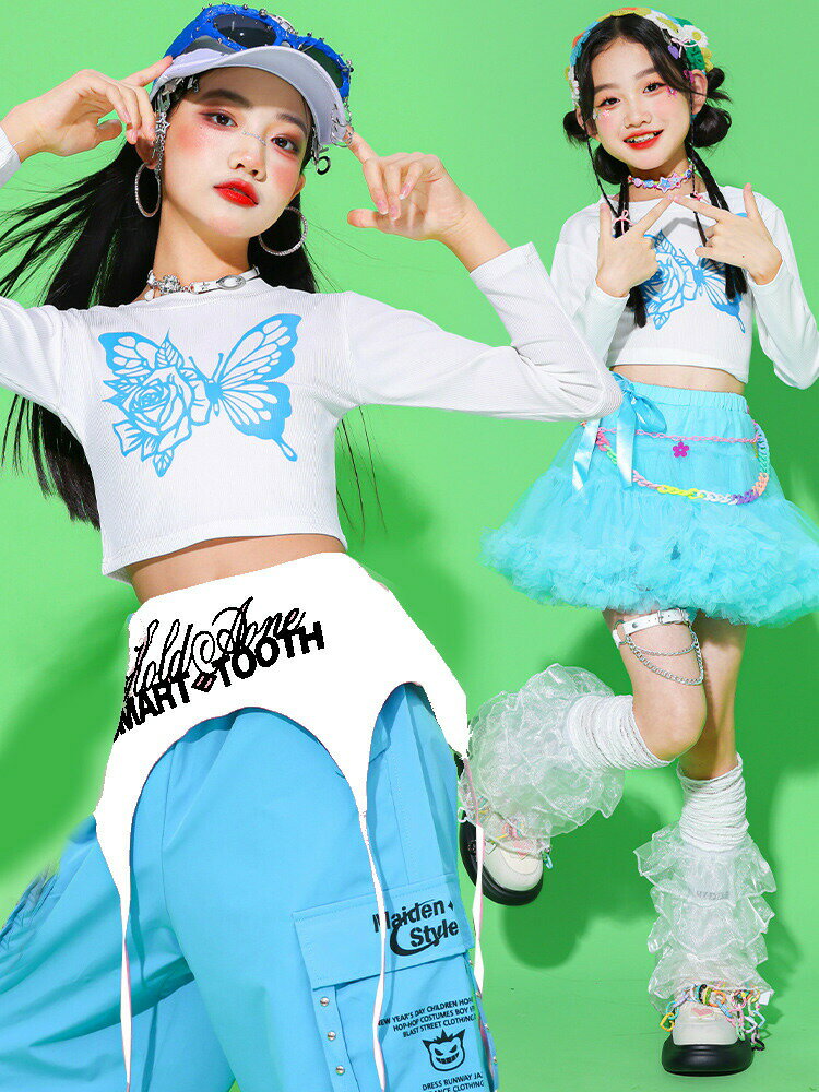 ブルー チュチュ キッズ ダンス服 チュールスカート カーゴパンツ 水色 女の子 セットアップ ガールズ ストリート系 ダンス衣装 ジャッズ 日常着 ジュニア jazz K-POP オシャレ 練習着 団体服 応援団 発表会 110-180