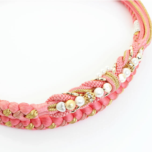 【訳あり商品】帯〆 帯締め 振袖向き 正絹 日本製 丸紐 四津打ち四本原 タテワケ かまぼこ型 ラインゴールドクロスパールビーズ〈ピンク〉ヤケ有