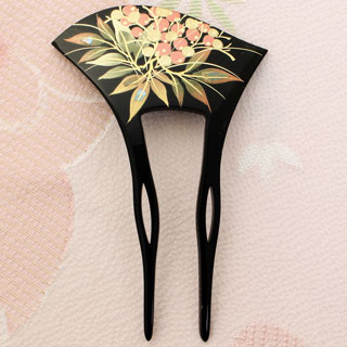 かんざし 黒漆調台 蒔絵 螺鈿 大南天 Rバチ型 くろ ブラック なんてん ナンテン ゴールド 赤 ピンク メタリック