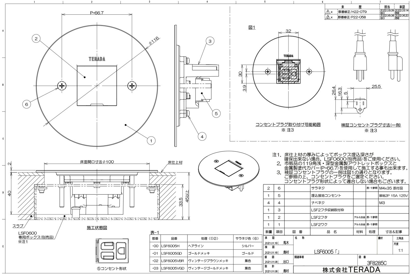 こちらの商品は外箱を開封された場合、返品交換を承ることは出来かねます。 (不良商品の場合は除く) 商品の品番・仕様等を充分にご確認頂いた上でご注文ください。 その他条件に付きましては 支払・配送方法 をご確認ください。 メーカー:TERADA (旧株式会社寺田電機製作所) 低床用 シルバー丸形プレート:器具(電源接地付×1) 仕様 型式番号: LSF6005H 適合床環境: 電線管床工事用 プレート: 丸型シルバー 用途: 接地2P15A125V平刃×1 施工条件: 床面開口Φ100(市販アウトレットボックスの場合Φ80〜Φ100) 必要床高45mm以上 適合BOX・塗代カバー: 低床施工の場合 専用打込ボックスLSF0600 市販品で施工の場合 大四角アウトレットボックス 大四角鉄製丸穴塗代カバーP=66.7 ご注意:樹脂製塗代カバーは適合外 特長 専用打込ボックスLSF0600を使用することで床高45mm(仕上材含み)より使用可能。 プレート厚を2mmで床との段差を極力なくした為、足元にやさしい製品です。 プレート:のフタは収納可能で、紛失の心配がありません。 取付ピッチ66.7mm ※組立品のため、ご注文後1-2週間程度お時間をいただく場合がございます。※組立品のため、ご注文後の返品・交換・キャンセルは出来ませんのでご了承ください。 関連キーワード 配線器具 埋め込み 床 フロア テラダこちらの商品は外箱を開封された場合、返品交換を承ることは出来かねます。 (不良商品の場合は除く) 商品の品番・仕様等を充分にご確認頂いた上でご注文ください。 その他条件に付きましては 支払・配送方法 をご確認ください。 メーカー:TERADA (旧株式会社寺田電機製作所) 低床用 シルバー丸形プレート:器具(電源接地付×1) 仕様 型式番号: LSF6005H 適合床環境: 電線管床工事用 プレート: 丸型シルバー 用途: 接地2P15A125V平刃×1 施工条件: 床面開口Φ100(市販アウトレットボックスの場合Φ80〜Φ100) 必要床高45mm以上 適合BOX・塗代カバー: 低床施工の場合 専用打込ボックスLSF0600 市販品で施工の場合 大四角アウトレットボックス 大四角鉄製丸穴塗代カバーP=66.7 ご注意:樹脂製塗代カバーは適合外 特長 専用打込ボックスLSF0600を使用することで床高45mm(仕上材含み)より使用可能。 プレート厚を2mmで床との段差を極力なくした為、足元にやさしい製品です。 プレート:のフタは収納可能で、紛失の心配がありません。 取付ピッチ66.7mm ※組立品のため、ご注文後1-2週間程度お時間をいただく場合がございます。※組立品のため、ご注文後の返品・交換・キャンセルは出来ませんのでご了承ください。 関連キーワード 配線器具 埋め込み 床 フロア テラダ