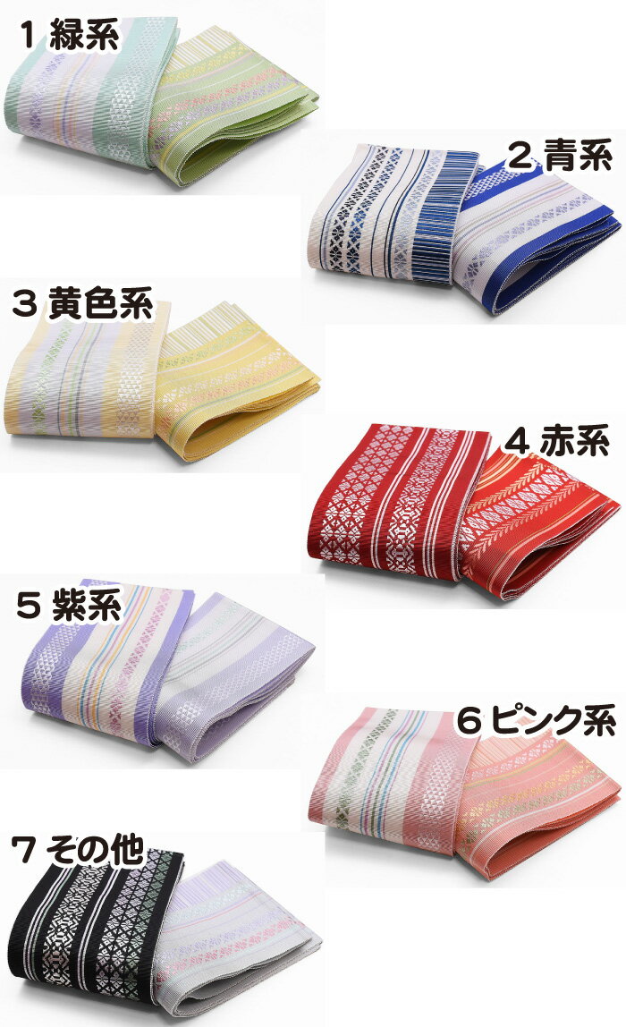 ※こちらの商品は柄などが多数ある為、お色の系統のみをご選択頂く形での販売となります。 ※写真に掲載のカラー・柄は一例となります。 例)【グリーン系】抹茶色、【青系】水色、【赤系】エンジ色、【黄色】カラシ色・黄土色 なども含まれます。 ※【その他】は各系統外のお色のお届けとなります。 柄などは全て当店お任せとなります。 また在庫の関係により同じ柄が届く場合もございますので何卒ご理解を頂けます様お願い致します。 中心部分は硬め、手先の締める部分は、柔らかく織り上げております。 ポリや綿などとは違い、緩みが少なくキュッと締めてくれる『絹素材』で、締め心地はもちろん、触り心地も良く、お着物・長襦袢に最適です。 【サイズ】巾:約10cm 長さ:約270cm ※メール便 発送をご希望の場合は、代金引換や到着日のご指定はできかねます。 予めご了承くださいませ。 ※商品の写真は出来る限り実物に近い色合いを表現できるようにしておりますがモニターの設定等によっては、多少の誤差が生じる場合がございます。 予めご了承ください。