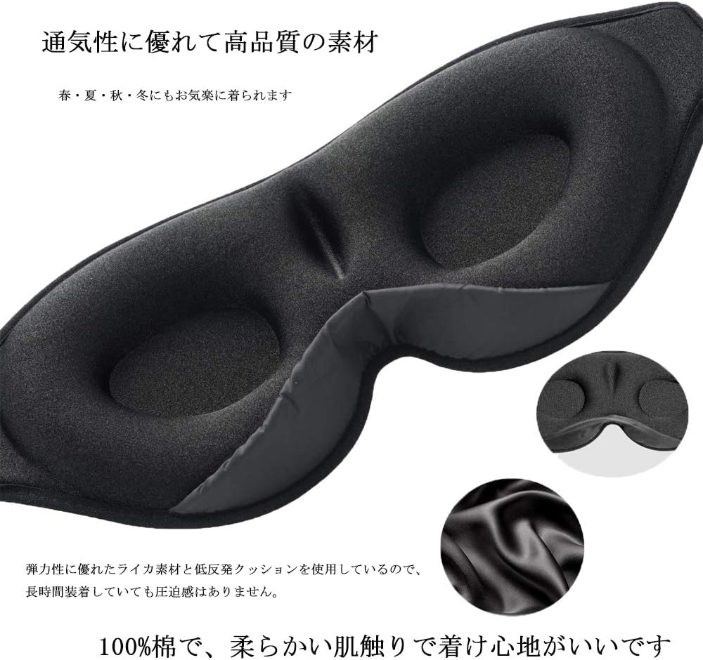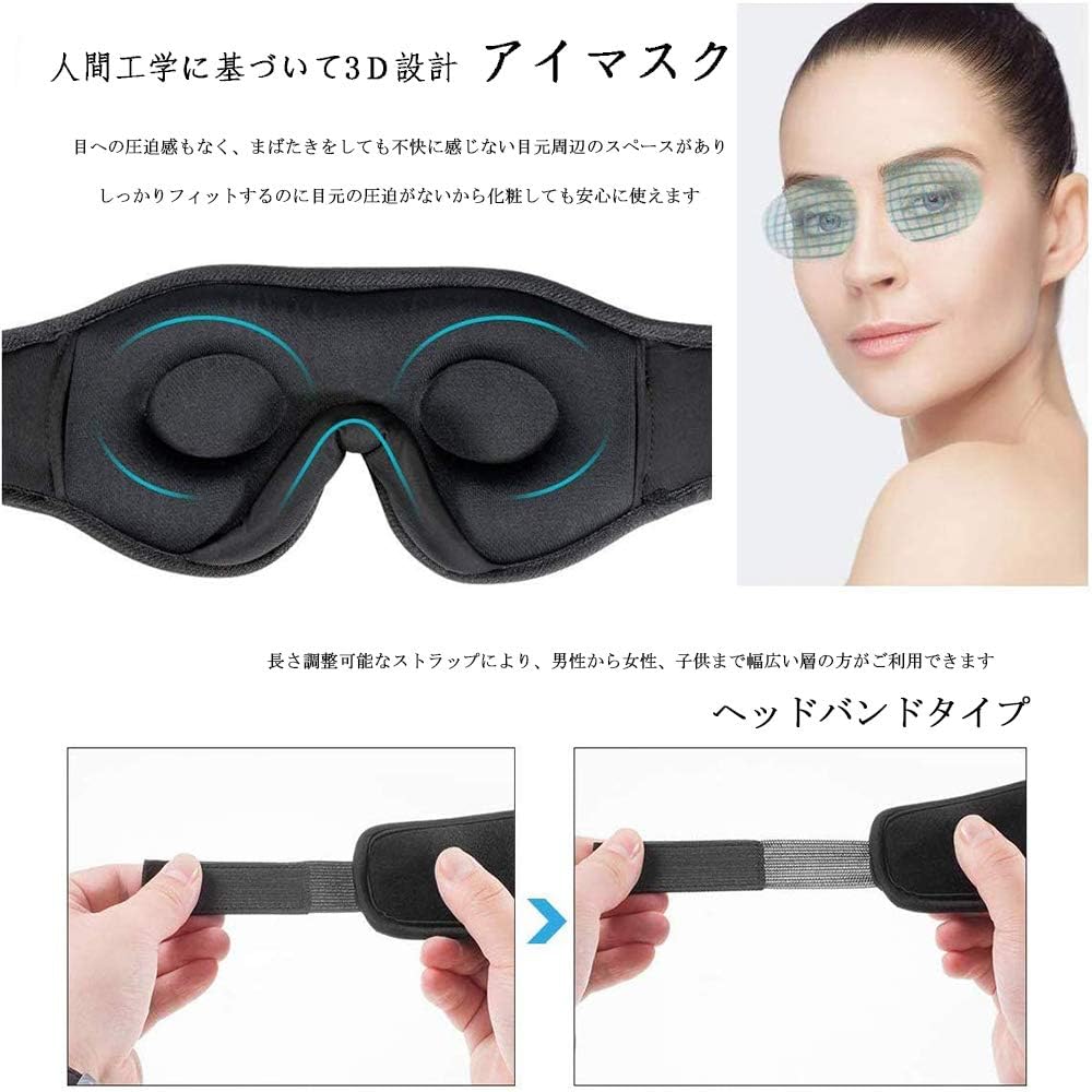 【安眠をサポートする遮光アイマスク】5つのユニークなデザイン、目にあたる部分をくぼませ、目に生地が直接当たらない、目の周りの柔らかいクッションで長時間利用でも痛くならない、鼻当て(ノーズパッド)が目元にフィットして目の下からの光を遮断。目にフィットする3D立体構造、顔に合わせて、目と鼻に圧迫感なしピッタリフィット。遮光性が良くてゆったり眠れる。自動シャットダウンタイマー機能があり、1時間または2時間以内にサウンドを停止したり、長時間再生したりすることができます。 【通気性に優れて高品質の素材】100%棉で、柔らかい肌触りで着け心地がいい快眠グッズ。着け心地とフィット感にこだわった高品質なアイマスク、弾力性に優れたライカ素材と低反発クッションを使用。軽量で非常に柔らかなさ、ソフトな肌触り。春・夏・秋・冬にもお気楽に着られる。マジックテープのデザインで、長さも調節可能、男女兼用。 【Bluetooth音楽機能付き】Bluetoothアイマスクはスマホと接続し、お好みの音楽を聴きながらリラックスタイムを楽しめ!更に、音量も調節できて、よく効いて眠る。横に寝っても、イヤホン内蔵で耳にも負担がなく快適に安眠。 【人間工学に基づいて3D立体型】3D低反発設計により、顔の面にも綺麗に密着してくれて、どんな顔でも使える。180度折りたたみ、軽量で持ち運びに便利なので、飛行機、新幹線や電車、夜行バス、車での長距離移動中の仮眠や、オフィスやお休み前での休憩時間など、ちょっとした休憩などに重宝。ご家族、母の日、父の日、恋人、ご友人、仕事や勉強、長時間の読書、パソコン、スマホ、ゲーム、車の運転、徹夜作業などの方にお勧め!誕生日・結婚祝い・新成人・新社会人・出産祝い・敬老の日・還暦祝い・クリスマス・ホワイトデー・プレゼント・ギフト・ラッピングとしても最適。 【USB充電式&12ヶ月品質保証】USB充電式で、繰り返し使用できるので、コスパがよく、オリジナルのボックスで梱包。 内蔵スピーカーを取り出し、アイマスク睡眠のカバーは洗えるので、いつでも清潔にご使用頂けるよ!ご購入後12ヶ月のメーカー保証、商品に関する使用上に何か問題がありましたら、お気軽にご連絡ください。