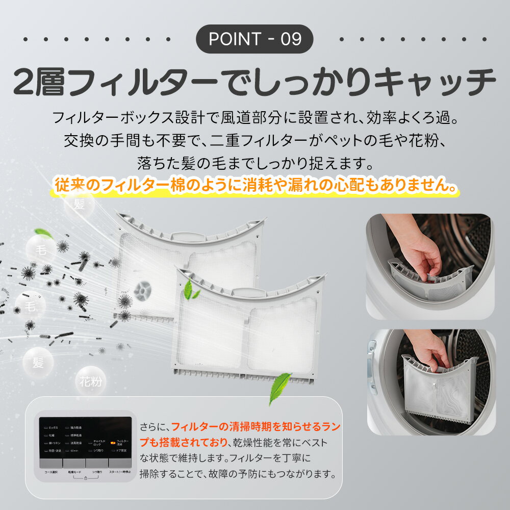 【new】きめ細やかな温度コントロール×軸流エアフロー設計:素早く、ムラなく、スピード乾燥。温度をきめ細かくコントロールし、独自の軸流エアフローで温風をしっかり循環。衣類のすみずみまでムラなく熱を届け、短時間でふんわりとした仕上がりに乾き上げます。 【new】もっと賢く、NTCモニタリング搭載:一般的な乾燥機(約20分ごと)に比べ、本製品はNTC温度センサーで5〜10分ごとに衣類の乾き具合を検知。短い間隔で見守り、乾いたらすぐに自動停止します。乾かしすぎを防ぎ、電気代のムダも削減。効率的で安心な乾燥を実現します。 【new】逆回転運転&絡み防止ポールでシワも絡まりもすっきり:ドラムは正反両方向に回転し、絡み防止ポールが衣類をやさしくほぐすことで、シワや絡まりを徹底的に防止。洗い上がりはふんわり柔らかく、毎日の洗濯も手軽で快適です。 【new】2層フィルターでしっかりキャッチ:フィルターボックス設計で風道部分に設置され、効率よくろ過。交換の手間も不要で、二重フィルターがペットの毛や花粉、落ちた髪の毛までしっかり捉えます。従来のフィルター棉のように消耗や漏れの心配もありません。 【new】細部までこだわったやさしさ:1.頑丈なメタルボディ上に物を積んでも安心。2.ワイドな取り出し口大きな衣類もラクラクに出し入れ。3.断熱・耐摩耗カバー物を置いても安心設計。Dimensions & Details・素材ABS・カラーホワイト・商品サイズ59*51*84cm・梱包数1・梱包サイズ88.5*65*58.5cm・重量(N.W.)36kg・重量(G.W.)38kg・生産国中国・組立品/完成品完成品・安全基準PSE認証済みご注意:高温殺菌/UV・高温の二重除菌(亚马逊buyer不要写UV,容易触发审核)商品の説明01:◆01毎日の洗濯をもっと快適にサポートシワを伸ばすことができます。天気に左右されない…冬や梅雨でも安定して乾かすことができます。生乾き臭を防ぐ…UV・高温の二重殺菌で、雨の日の部屋干し特有の生乾き臭に悩まされる心配はありません。PM2.5や花粉、黄砂、火山灰などの付着予防…梅雨時期以外にも、花粉や黄砂の飛来多い日にも、様々な有害物質が洗濯物に付着することを防ぐことができます。◆02 8KGのたっぷり容量で快適乾燥最大8kgの大容量設計で、忙しい日々をサポートする頼もしいアイテム。天候に左右されることなく、いつでも清潔で快適な衣類を手に入れることができ、家族全員分の洗濯物を一度に素早く乾かすことができます。これにより、乾燥回数が減り、電気代の節約にもつながります。洗濯量の目安(ご参照まで)シャツ(約15件)ジーンズ(約10件)タオル(約25件)寝具カバーセット(約1セット)◆03直感操作パネルシンプルな操作で、誰でもすぐに使いこなせる4つのボタン。モードやコースの切り替えが直感的にできるため、複雑な操作を気にせず、すぐに乾燥を開始できます。忙しい日常でも快適に使える設計で、時間を節約し、毎日の洗濯をより楽にしてくれます。簡単4ステップでプロ仕上げ1.電源を入れる2.コースを選ぶ3.乾燥モードを選ぶ4.スタートボタンを押すシワ取りを希望する場合は、押しだけで選択できますので、さらに便利にご利用いただけます。パネル隣ではおすすめの組み合わせについてもご紹介しています★◆04各ボタンのご紹介電源スイッチボタン押すだけで「ミックス」コースと「標準乾燥」モードが自動的に設定され、忙しい毎日でも素早くスタート。これで、もう天候や時間に縛られることなく、いつでも清潔な衣類が手に入ります。スタート / 一時停止ボタン操作がシンプルなスタートボタン。一時停止状態が10分続くと自動的に電源がオフになる安心設計で、エネルギーを無駄にしません。乾燥コース選択乾燥コースを選択すると、センサーが衣類の状態を検知し、温度と乾燥時間を自動で最適に調整します。乾燥が完了すると自動で停止するので、手間いらずで安心してお使いいただけます。ミックスコース異なる素材の衣類が混在している場合に最適な万能コースです。約45~55℃の適温で乾燥を行い、デリケートな素材も安心してお任せいただけます。例えば、お子様の学校用ユニフォームとタオルを一緒に乾燥しても、すべてがちょうどいい仕上がりに。家事の効率を大幅にアップさせます。化繊コースポリエステルやナイロンなどの化繊素材に特化したコース。温度を50℃以下に抑えることで、型崩れや縮みを防ぎ、長く美しい状態を保ちます。綿・リネンコース綿やリネンの素材に適したコースです。約45~55℃でじっくりと乾燥することで、肌触りの良さや吸水性を損なわずに仕上げます。大切なシーツやタオルのふわふわ感を守りながら、家庭での贅沢な洗濯体験を実現します。脱臭コース衣類の気になる臭いを手軽に除去できるコースです。50℃で約20分間乾燥を行い、タバコ、汗、料理の臭いを効果的にリフレッシュ。忙しい毎日に少しのリセットタイムを提供します。会議やお出かけ前にも活用でき、いつでも自信を持って行動できます。乾燥モード選択3つの乾燥強度か