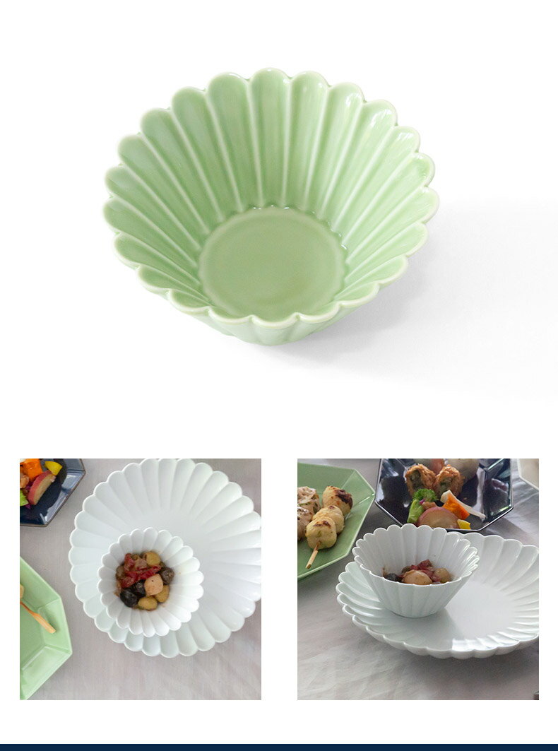 波佐見焼 洸琳窯 菊彫反鉢 小 食と器のコラボレーション、日々の美味しいに繋げたい和食器は、古くから食文化に関わって現在、 波佐見焼の産地で数少ない手書きの技法を多用している窯元です。 熟練した技術を持った職人たちが染付けの筆一本を使い 白磁のキャンパスに様々な紋様を描いていきます。 藍色の染付けの奥深い魅力を皆様の食卓でもお楽しみください。 名 称 波佐見焼 洸琳窯 菊彫反鉢 小 柄 洸琳彩釉 緑釉 白マット サイズ 直径11×H5.1cm 素材 陶磁器 生産国 佐賀県波佐見町 窯元 洸琳窯 使用 食洗機○ 電子レンジ○ 用途 副菜やスイーツなどの小鉢として 商品説明 菊の花をイメージした菊彫りシリーズ。器を上から見ると菊の花がぱっと咲いているよう。和洋どちらでも、どんな料理を盛ってもテーブルを華やかにしてくれます。重ねてスタッキング出来るので収納にも場所を取りません。 ブランド 波佐見焼 洸琳窯 八角長角皿 菊彫 注意 ※実際の商品の色や柄は画像と少々異なることがありますが、あらかじめご了承ください。 ※商品画像の装飾物は付属されません。 ※同じ商品を追加でご購入いただく際も、1点1点雰囲気には違いがございますことを、予めご了承ください。