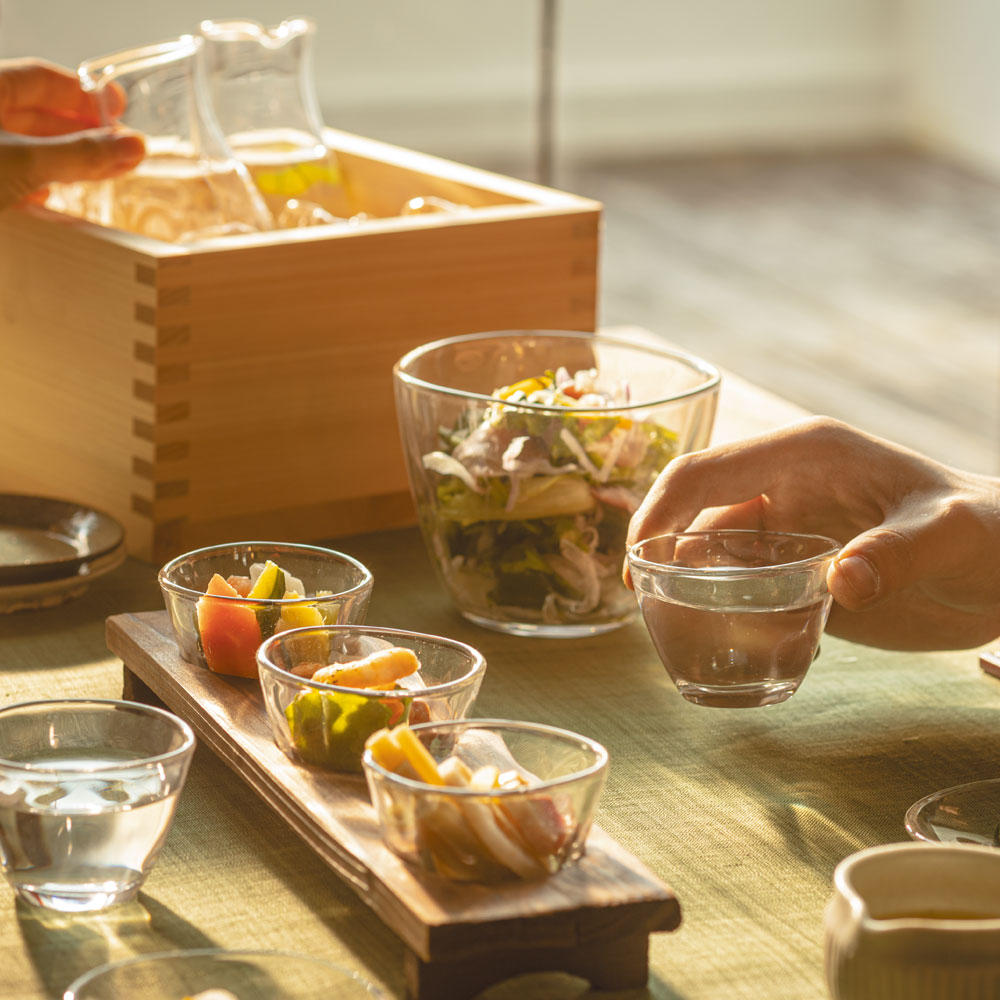 バイヤーのオススメコメント 容量約90mlのガラス盃を3個セットにしました。ご自宅で利き酒するのも良いですし、店舗用品としても高級感が演出できます。木製の台付きで、一段格調高くお酒を楽しむことができますよ。手づくり風の柔らかさを感じる『てびねり』の酒器で、お気に入りのお酒をお楽しみください。【てびねり】てびねりとは陶芸の技法のひとつで、ろくろを使わず、全て人の手によってカタチを作り上げることです。てびねりで気持ちを込めて作ったカタチを、忠実にガラスに写し取り、柔らかな表情の器に仕上げました。陶器や土ものの和の器との相性も良く、厚めで丈夫なので普段お使いいただくのに最適です。 仕様 盃サイズ:φ7×高5(cm) 盃容量:約90ml 木台サイズ:31×8×高3.3(cm) ラッピングをご希望のお客様は、ラッピング用品も同時にお買い求めください。 この商品は、以下のラッピングが可能です。 ◎和紙包装紙 50円ガラスの酒器 アルコールグッズ