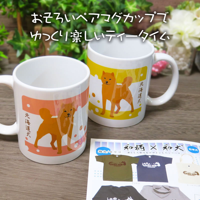 北海道犬 名入れペアマグカップ(北海道犬とあられ) かわいい和風デザインのオリジナルイラストが印刷されたペット雑貨。愛犬や飼い主のお名前入りでお届け!誕生日プレゼントや贈り物ギフト、結婚祝いやイベントの記念品に最適な和柄グッズ おしゃれ