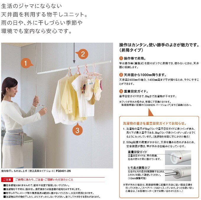 商品情報商品名ものほし上手 天井埋込昇降タイプ ショート(1400mm)型番FQ0401-2N干し竿長さ約1208mm本体サイズ1400×120×36mm操作棒長さ約1300mm最大ストローク約1000mm(天井面からの最大下降量)材質カバー:スチール製(粉体塗装)竿:アルミ製(アルマイト処理)耐荷重目安約5~8kg設置方式天井埋込タイプ(施工が必要)付属品操作棒・フック1個・固定ビス生産国日本製お届けについてこちらの商品はお取り寄せ品となります。メーカー在庫有りの場合、3-5営業日にて出荷可能ですが、品切れになってしまうこともございます。その場合、お客様には必ず連絡をいたしますが、万が一入荷予定がない場合は、キャンセルさせていただく場合もございますことをあらかじめご了承ください。大建 【DAIKEN】 室内物干しユニット FQ0401-2N ものほし上手 天井埋込昇降タイプ ショート(1400mm) 省スペース・昇降式物干し DIY 日本製 使わないときは天井にすっきり収納!花粉・雨の日対策に最適な天井埋込型室内物干し。 【商品説明文】暮らしにフィットするスマートな室内物干しユニット。DAIKENの「ものほし上手 FQ0401-2N」は、天井にすっきり埋め込める昇降式の室内物干しです。天井にフラットに納まるスタイリッシュ設計で、生活空間を邪魔しません。花粉や黄砂、雨の日にも安心して部屋干しできます。◆特徴 昇降操作が簡単! 半回転の操作棒を回すだけで干し竿の昇降が可能。 最大1000mm降下 天井面から最大1mまで竿が下がるため、干しやすく誰でも使いやすい。 安心の重量目安ガイド 干し竿の両端に目安表示付き。適正重量(約5kg~8kg)で安心して使用可能。 生活感を感じさせない美しい収納性 使わないときは天井にスッキリ収納、空間を有効活用。 日本製・高品質 国内メーカーDAIKEN製。安心と信頼の品質です。【ご注意】・設置には天井の開口および埋込施工が必要です。施工は専門業者にご依頼ください。・操作棒は本体に埋込収納可能です(共通仕様)。・指定の吊り下げ重量を超えないようにしてください。(お届けについて)こちらの商品はお取り寄せ品となります。メーカー在庫有りの場合、3-5営業日にて出荷可能ですが、品切れになってしまうこともございます。その場合、お客様には必ず連絡をいたしますが、万が一入荷予定がない場合は、キャンセルさせていただく場合もございますことをあらかじめご了承ください。 7