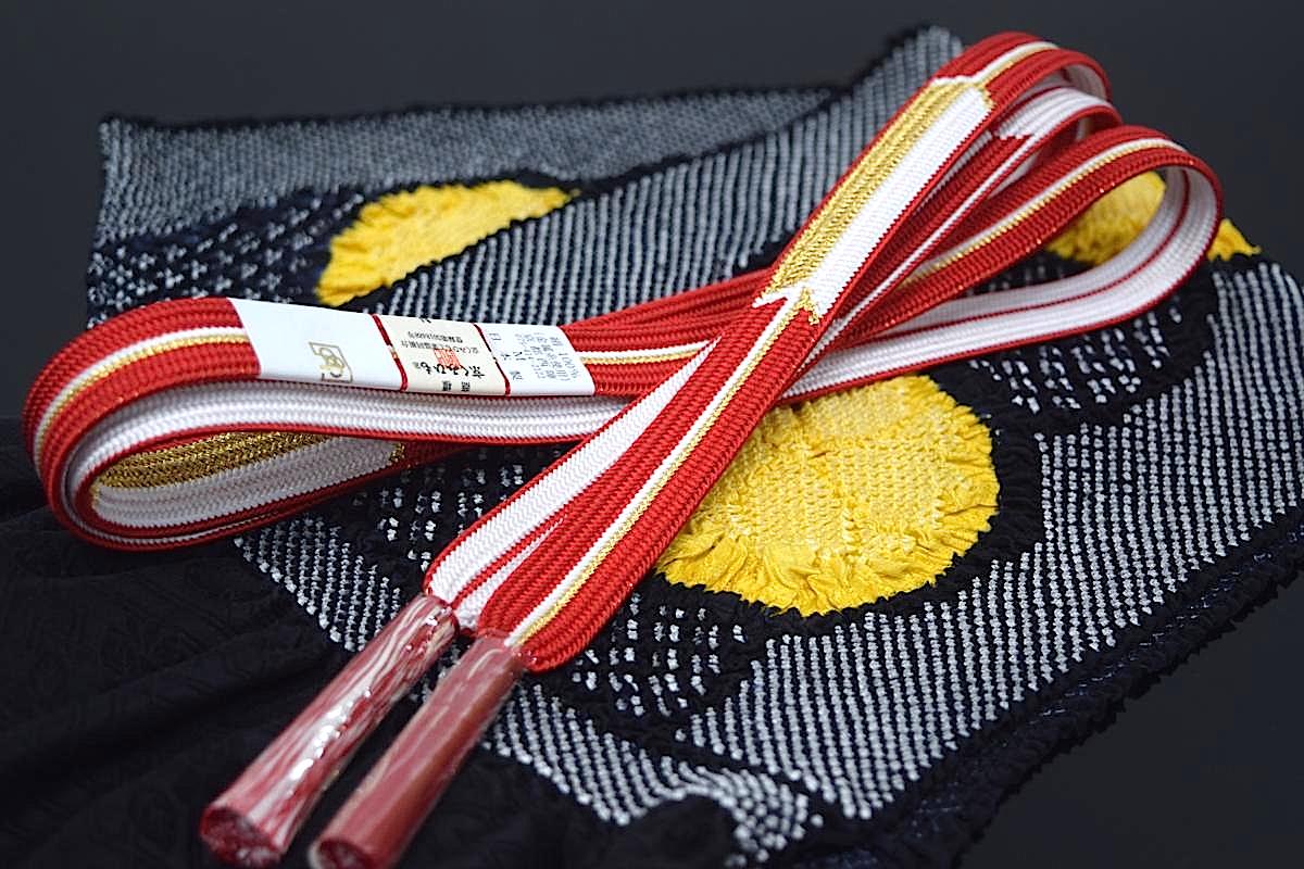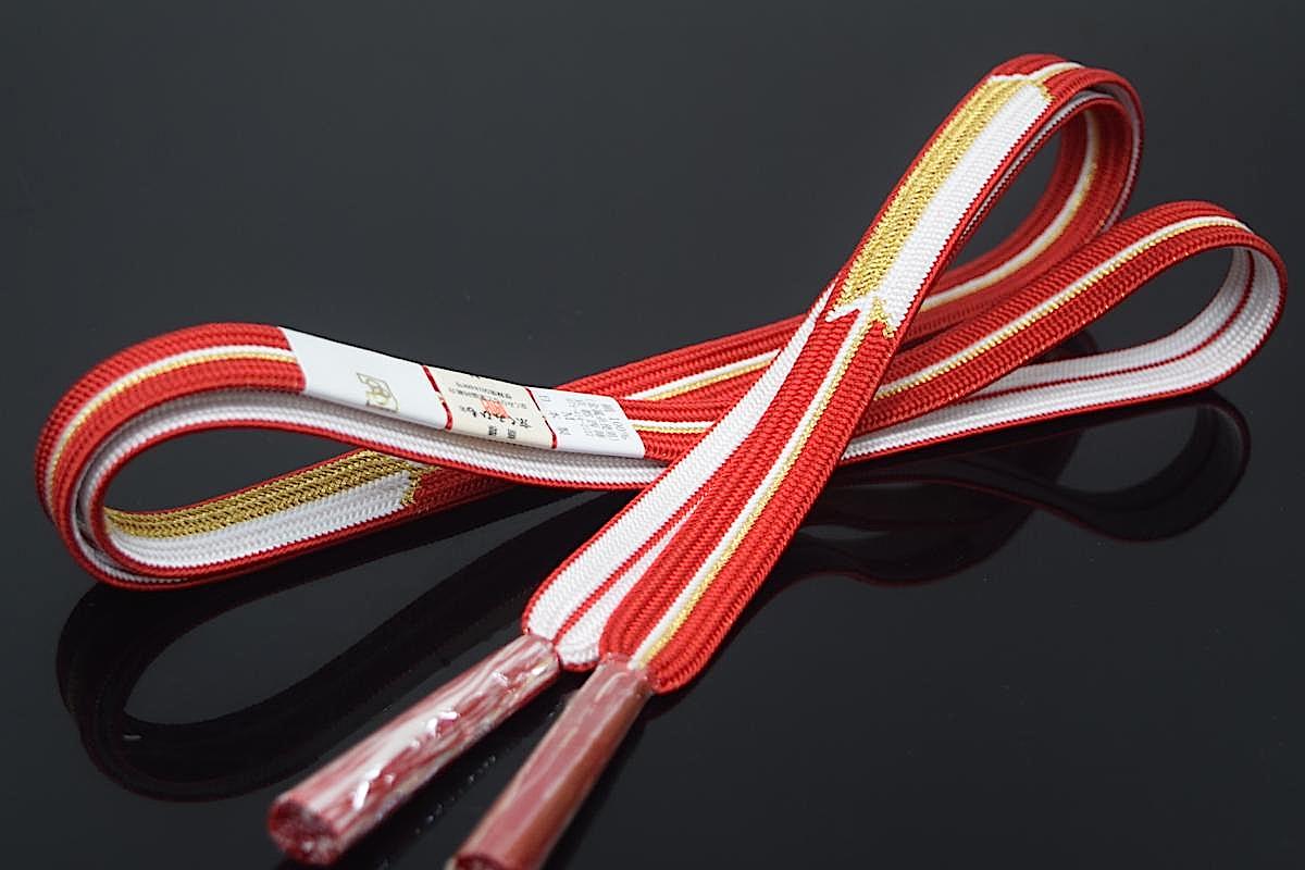 【京くみひも】【振袖用帯締め】【日本製】【手組み】【広幅 平組】正絹帯締め「矢羽根(赤×金×白)」