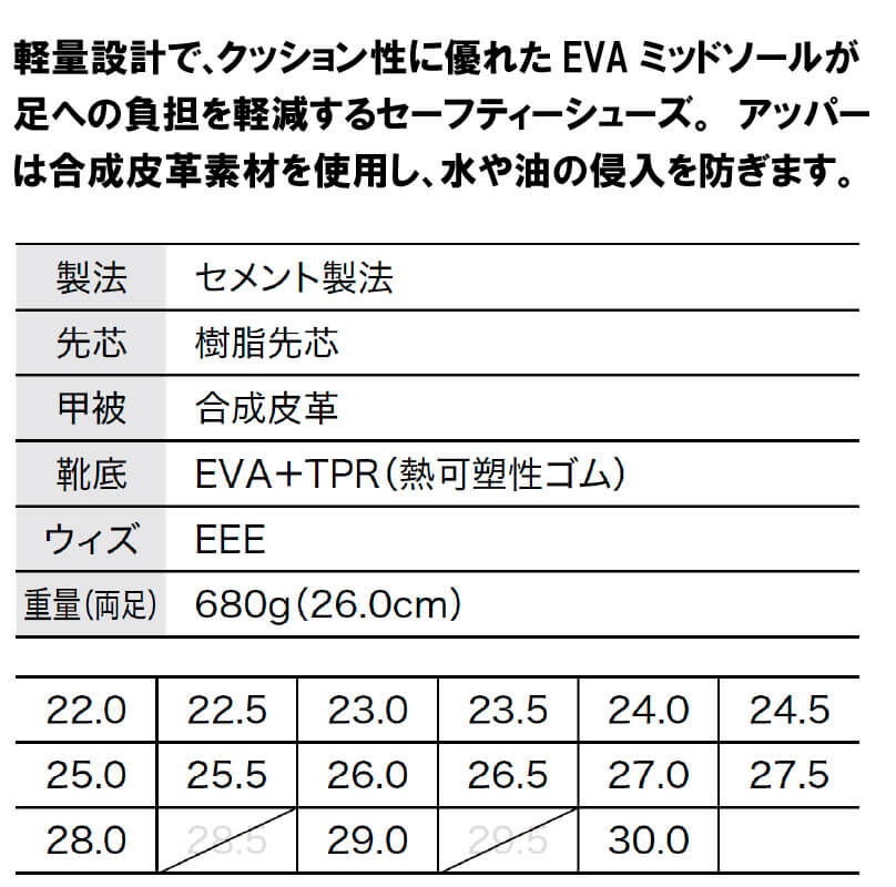 ■特長 ・スポーティでスタイリッシュなデザイン ・軽量設計で長時間作業も快適 ・通気性の良いアッパーで蒸れにくい ・耐滑性に優れたアウトソールで安心 ・先芯入りで安全性を確保 ■素材 合成皮革+メッシュ(アッパー) EVA+ラバー(ソール) ■サイズ 22.0cm 〜 30.0cm ■カラーバリエーション ネイビー(10) グレー(20) ホワイト(32) ブラック(90) ■用途 建設現場・倉庫作業・運送業・軽作業など幅広く対応