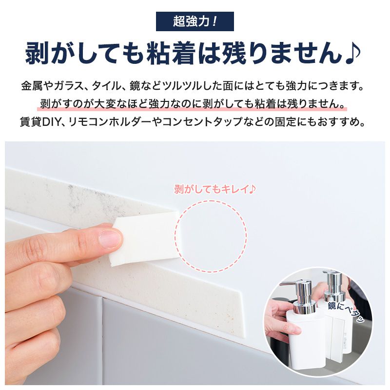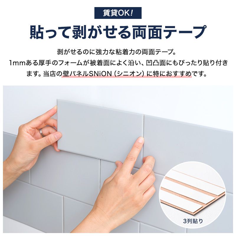 オススメポイント ★貼って剥がせる両面テープ -------------------------------------------------- 剥がせるのに強力な粘着力の両面テープ。 1mmある厚手のフォームが被着面によく沿い、凹凸面にもぴったり貼り付きます。当店の壁パネルSNiON(シニオン)に特におすすめです。 ★剥がしても粘着は残りません♪ -------------------------------------------------- 金属やガラス、タイル、鏡などツルツルした面にはとても強力につきます。剥がすのが大変なほど強力なのに剥がしても粘着は残りません。賃貸DIY、リモコンホルダーやコンセントタップなどの固定にもおすすめ。 ★1枚300g程度の軽量な壁材にもおすすめ -------------------------------------------------- 当店で販売中の壁パネル「Hattee ハッティ」、「kumikkiくみっき」、「Sottileソティーレシリーズ」にも使えます。裏面テープの上から貼れば、剥がせるウォールパネルに早変わり♪ ※Hattee(ハッティ)、kumikki(くみっき)は元のテープに重ねるため、厚み分浮きが出ます のでご注意ください。 商品詳細 ■サイズ 25mm×10m ■厚み 1mm ■重量 94g ■材質 ポリエチレン発泡体、アクリル系粘着剤 ■粘着力 (1面)4.39N/10mm (2面)3.35N/10mm ※この特性値は測定値の一例であり保証値ではありません。 ■生産国 日本 ■用途 被着体に傷をつけず原状回復が必要な、金属・ガラス・プラスチック・樹脂・タイルなどの接合。POP作成等。 ■使用量目安 マグネットアイテム使う場合(横3列貼り):シニオン10×20 1巻でシニオン10×20を17〜18枚貼れる想定。 マグネットアイテム使わない場合(四隅と真ん中5点貼り):シニオン10×20 1巻でシニオン10×20を66〜67枚貼れる想定。 ■保管の仕方 ・テープを保管する場合は、直射日光を避け涼しいところに置いてください。 ■その他 ・電気絶縁用には使用しないでください。 ■商品の注意事項 ・テープは壁にしっかり押し付けて貼ってください。正しく貼れていないとテープの粘着強度にかかわらず剥がれが起きます。 ・SNiON(シニオン)に貼り付けの場合、マグネットを取り付ける前に数日間剥がれが起きないか様子を見てからご使用ください。 ・新設または防汚機能のある一般的な国産壁紙は、表面を傷つけることはありませんが貼り付かない場合があるためご使用はおすすめいたしかねます。 ・再剥離タイプの粘着剤を使用しておりますが、被着体の材質・表面状態および表面強度の弱い材質・貼り付け期間によって、粘着剤が残る場合や表面破壊、剥がれが起こる恐れがあります。あらかじめ試験の上ご使用ください。 ・火の近くや水が多量にかかる場所、屋外にはご使用にならないでください。 ・剥がれによる破損など当社は一切の責任を負いません。 ・テープを剥がす際は、ゆっくり剥がしてください。 ・凹凸の多いものには貼りつかない場合があります。 ・一度剥がしたものは粘着力が弱まっているためお使いいただけません。 ・人体(皮膚)には直接貼らないで下さい。かぶれる場合があります。 使用方法 ■貼り方 ・貼りつける面のほこり・油分・水分などをよく拭き取ってください。 ・施工時は、テープを貼った部分を上からしっかり押さえてください。 ○圧着ローラーの使用がおすすめです。 ×叩いたりしないでください。周囲のテープが浮く原因となります。 ■剥がし方 ○貼り付け面と平行になるようにゆっくりと剥がす。 ×被着面から持ち上げるように引っ張って剥がさないでください。 ・剥がしにくい場合はドライヤーなどで温めると剥がしやすくなります。 貼れるところ・貼れないところ ■貼れるところ:ツルツルしている壁面 ・磁器または陶器タイル ・PVC壁材 ・メラミン壁材 ・PVCシート ・鏡、ガラス ・金属 ・プラスチックなど ※いずれも長期間・高温下では糊が残る可能性があります。 ■貼れないところ:凹凸の激しい、ザラザラしている壁面またはコーティングされた壁面 ・壁紙※ ・砂壁、綿壁、土壁、漆喰壁等 ※国産のビニルクロスは貼り付くものと貼り付かないものがあるためおすすめしません。 ■剥離時表面が傷つく貼れないところ ・紙 ・不織布 ・塗装面 ・木材 ・畳 ご注文のご注意事項 ■パソコンの環境によりモニター画面上の色と実際の商品の色の見え方が異なる場合がございます。 ■ご注文後の変更・交換・キャンセルはお受けすることができません。 また、出荷後の住所・送付先の変更は転送料が必要となりますので、ご注文前にお届け先住所を必ずご確認ください。 ■ご注文の前に当店のご注文規定を必ずご確認ください。ご注文の際は、こちらのページの内容をご理解いただいたものと判断させていただきます。 Hot Keyword---両面テープ 超強力 強力両面テープ 日本製 木部 壁紙 床材 クッションフロア 壁材 ウォールパネル 壁パネル 施工 DIY コニシオススメポイント ★貼って剥がせる両面テープ -------------------------------------------------- 剥がせるのに強力な粘着力の両面テープ。 1mmある厚手のフォームが被着面によく沿い、凹凸面にもぴったり