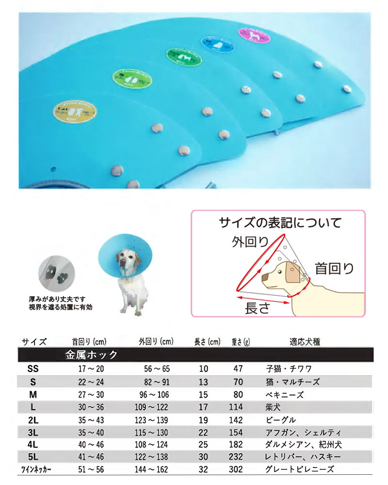 【仕様変更のお知らせ】金属ホックのメス(凹)側が、3列から2列へ変更になりました。(2025年12月14日更新) 視界を遮る処置に有効な、金属ホック仕様のアニマルネッカーです。 厚みがあり丈夫なため、繰り返し使用できます。 クリア素材に比べて張りがあり、脱色の心配もありません。 【サイズ】 サイズ:首回り(約)40〜46cm、外回り(約)108〜124cm 長さ:(約)25cm 適応犬種:紀州犬など 【ご注意】 ※上記のサイズ・犬種はあくまで目安です。わんちゃんは個体差がありますので、ご購入の前に必ずわんちゃんのサイズを実際に計測して適合するサイズをお求めください。 ※パッケージ等の仕様・性能は、メーカーや製造元都合により予告なく変更する場合がありますのでご了承ください。 【送料無料※一部地域を除く】 この商品は送料無料(※沖縄県を除く)です。 ※沖縄県への配送では送料500円がかかります。 おすすめ