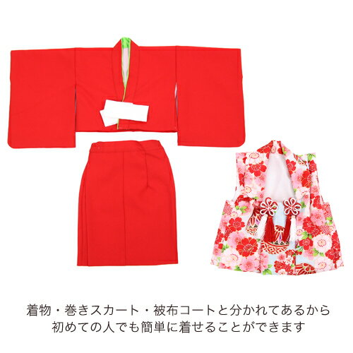 【レンタル予約状況】 *上記の日程の間は予約不可。 日程の記載がない場合は予約可能です。 ※こちらはレンタル商品です※ >>レンタル商品ご利用ガイドはこちら 一歳の女の子に 被布着物レンタルセット! せっかくのお祝いの日だから、いつもより 可愛くしてあげたいですね! 多くの家族の晴れの日を演出する 簡単二部式着物のセットで お届けします。 ひなまつり・初節句・お正月 ご兄弟の七五三やお祝い事など… 様々なシーンにお使いいただけますよ。 -セット内容- 着物・被布コート・巻きスカート 【素材】 (着物・被布コート・巻きスカート共に) 表地…ポリエステル100% 裏地…ポリエステル100% 【サイズ】 ●着物 身丈…約27.5cm 裄…約37.0cm 袖丈…約32.5cm ●被布コート 身丈…約36.5cm ●巻きスカート 身丈…約36.0cm ※二部式なので上下でサイズ調節が可能です。 上記のサイズは目安としてご参考ください。 ※レンタル商品のため、お客様が 身上げ・肩上げなど衣服を加工することは できませんのでご了承くださいませ。※キャンセルについてご注文日・ご使用日によりキャンセル料がかかる場合がございます。弊社よりキャンセル料金をご連絡させて頂きました日より1週間以内のお振込みをお願いしております。※こちらは1歳用被布着物セット レンタル商品です※ レンタル予約状況を確認いたしまして、 レンタル可・不可のご連絡をさせていただきます。 1歳女児用 簡単着付けの二部式着物!初節句・ひなまつり・お食い初めなど…和なでしこが大切な記念日を最高の思い出にするお手伝いをさせて頂きます。 赤色の無地がすっきりと可愛い着物。 独特の光沢を放つ生地が豪華でめでたい印象です。 水色の被布には桜と鞠が可愛く爽やか。 晴れやかなお祝いの一日にぴったりなデザインですよ。 →他の1歳用着物レンタルはこちら できるだけ実物に近いように撮影・画像処理をさせていただいておりますが、お客様のモニター環境などにより実際の商品とカラーが 若干異なって見える場合がございます。カラーやサイズなどのご心配がございましたら遠慮なくお問い合わせください。 七五三着物セット 身丈 袖丈 裄丈 着物 27.5cm 32.5cm 37.0cm 被布コート 36.5cm - - 巻きスカート 36.0cm - - 素材 表地・裏地 ポリエステル100% ・ セット内容 ・ 着物・被布コート・巻きスカート ・ 備考 ・ ※二部式なので上下でサイズ調節が可能です。上記のサイズは目安としてご参考ください。※商品の柄の配置は写真とまったく同じではございません。予めご了承下さいませ。