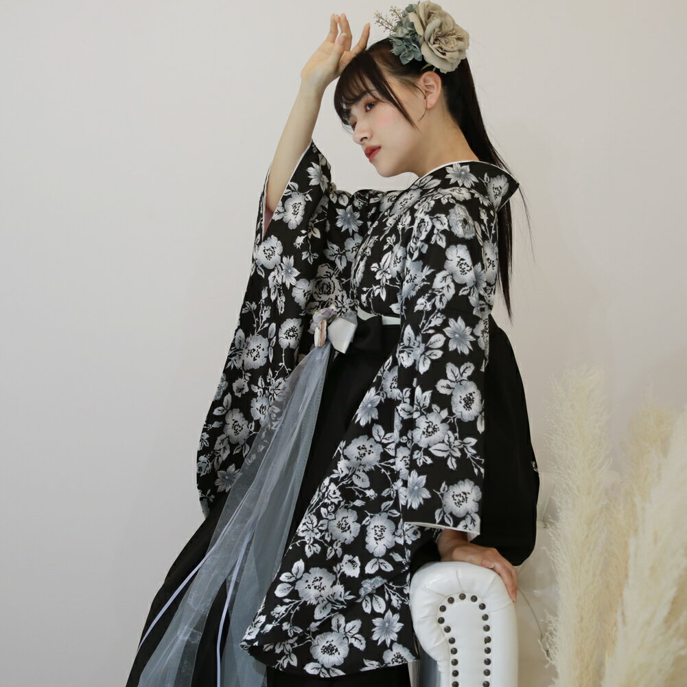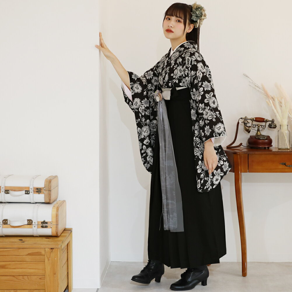 【販売】卒業式 袴セット 購入 大学生 女性 4点セット 購入 販売 卒業式袴セット 2尺袖着物&袴「黒地に白とグレーのアネモネと花々」袴セット 二尺袖 女 大学生 大学 大人 シンプル モダン モノトーン〔zu〕
