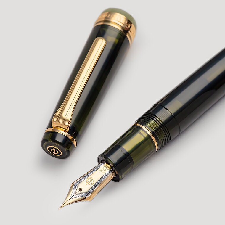 ≪詳細≫ ペン先 : 21金(新デザイン) サイズ : EF(極細)/F(細字)/MF(中細)/M(中字) 機構 : コンバーター・カートリッジ両用式 長さ : 129 mm (未使用時)/149 mm(筆記時) 太さ : 13 mm/18 mm(最大) 重さ : 21 g 材質 : PMMA樹脂/透明 付属品 : コンバーター・インクカートリッジ・説明書 ・保証書 説明書 ・保証書・純正ケース 配送方法 : 宅配便今回ご紹介する万年筆は、 WANCHER×SAILOR プロフェッショナルギア「シャンパーニュグリーン」です。 セーラー万年筆を代表するモデル「プロフェッショナルギア」。 独特なフォルムに、洗練された現代的デザインを感じさせる、 スマートでおしゃれなモデルとして知られてきました。 手に触れた瞬間からから感じる、最高の筆記具だけが持つ書き心地の良さ。 どんな高額万年筆と比べても、遜色ない存在感は『さすが』の一言につきます。 シャンパン(正式にはシャンパーニュ/AOC,AOP)を代表する有名ブランドの一つ、 それが「ドン・ペリニヨン」通称「ドンペリ」、ヨーロッパ有数の コングロマリットLVMH有するブランドでもあり世界的にも広く知られています。 フランスの誇る優良銘柄シャンパン「ドン・ペリニヨン」のボトルのような 深く透き通る緑色「シャンパーニュ ダークグリーン」に、 私たちは特別な意味合いを込めています。 大事な人との大切な催し物や記念日、その貴重な瞬間を祝い、 飾るシャンパンの香りと味わい、その瞬間の高揚感と 感動を感じていただければと思います。 もちろん使い心地も抜群。書き味・インクフローにもセーラー万年筆の誇りが生きています。 セーラーのペン芯は精密な機械で作り出され、ペン先の仕上げも万年筆職人により 1本1本厳しく検査された後、素晴らしい製品として送り出されるのです! ですから、どの万年筆も安定したインクフローと書き味を楽しむことができるのです。 この抜群の書き味は、一度味わってしまうと癖になりそうな逸品です。 しなやかな21金のニブは、漢字の止め・跳ね・払いをきれいに表現してくれます。 お祝いや記念日、大切な方への贈り物に・・。