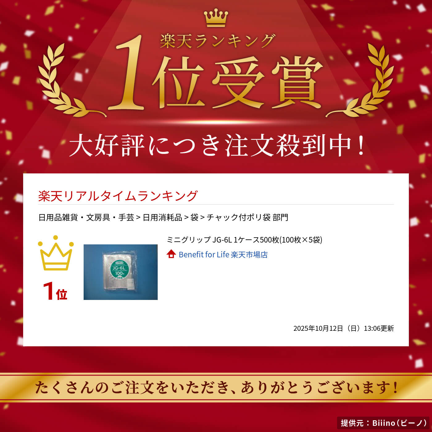 商品概要 材質 ポリプロピレン(PP) 色 透明 サイズ 厚み:0.06mm チャック下:480mm 袋巾:340mm 入数 500枚(100枚×5袋) 特徴 透明性が高く防湿性があるチャック付袋です。厚手タイプでより高級感が増します。 用途 手芸品、繊維製品、日用雑貨品農産加工食品、海産加工食品など ◆サンプル品のご要望が御座いましたら、下記の「商品についてのお問合せ」よりご用命下さい。 ◆品質には細心の注意を払っておりますが、お気づきの点が ◆もし不良品が混入していた場合は、弊社の責任にてお取替えさせて頂きます。■パチパチパチッという心地良い音と感触!開閉が楽しくなります♪■ 【乾燥物の包装に適しています。】