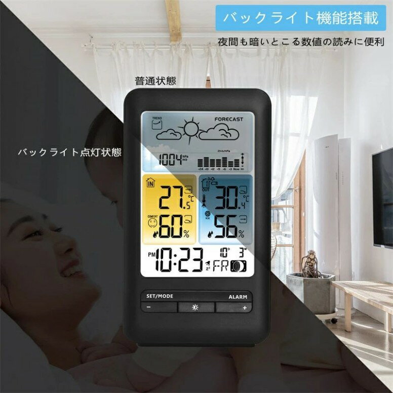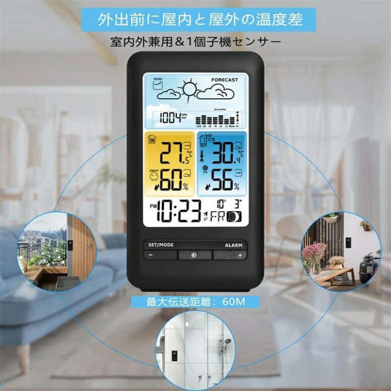 【室内外兼用温度計&1個子機センサー】室内でも両方の温湿度がチェックできる便利な温湿度計です。子機センサーから親機に測定結果を送信できる距離は見通しの良いところで約60mです。 子機センサー利用して、2ヵ所の測定値は自動的に親機に送信します。エアコンを使うときにはとても役に立ちます。【ワイヤレス温湿度計 高精度】親機温度:-9℃〜50℃(32°F〜122°F);子機温度:-40℃〜70℃( -40°F〜158°F); 湿度:20%RH ~ 95% RH;精度:±1℃ /± 2°F(温度) ±5%RH(湿度) 。【見やすい&健康管理】本体サイズ:14.9cm*8.5cm*4.5cm。小さくて邪魔にならず、文字は見やすい大きさで、2箇所での温湿度が一目でわかることです。家族の健康管理に、インフルエンザや風邪な どの予防対策に、お部屋の乾燥チェックでお肌の潤いを保つのに、他にも、カビ対策や熱中症対策などに役立ちます。【多機能デジタル温湿度計】タッチパネルを搭載し、簡単で使いやすいです。また、日付・天気予報・カレンダー・時間・スヌーズ・目覚まし・最高最低温湿度・バックライト機能がありまして、多機能は一体になることで大便利です!