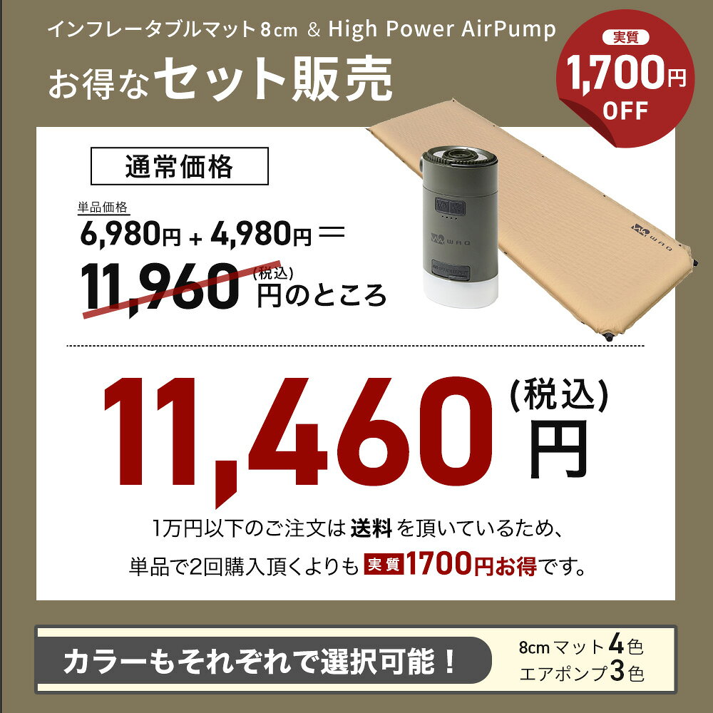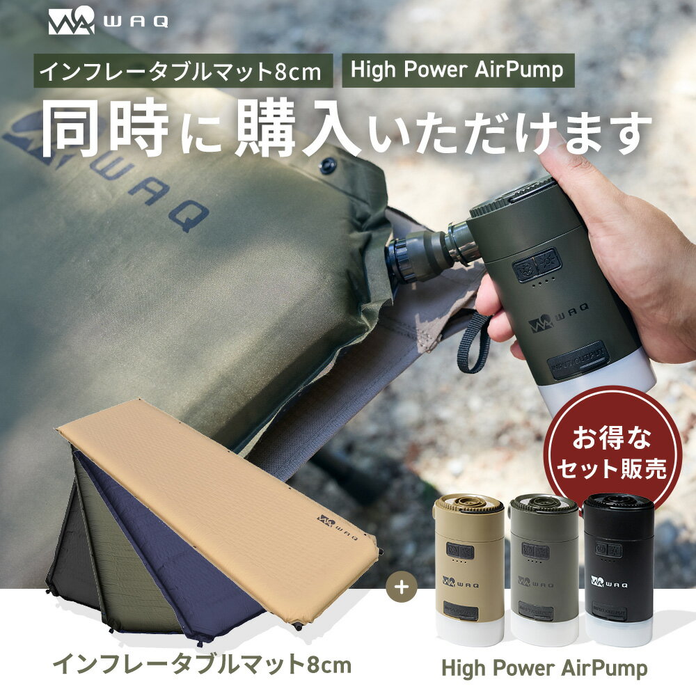 【お得なセット価格】 インフレータブルマット8cm+ エアポンプセット WAQ 車中泊 キャンプ用インフレーターマット エアポンプ 最大4.5kpa 空気入れ ランタン機能付き 【送料無料/1年保証】