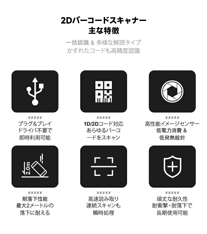 商品情報メーカー名和信テックサイズ/重量94×68×179mm / 203g商品説明モデル/WS1200 OS Windows、iOS、Android イメージセンサー CMOS 640 (H)*480 (v)pixels 光源/照明 ターゲット: 625 nm LED; 照明:4000K LED スキャンモード/手持ち、自動検出 フレームレート 30fps 解像度 4mil以上 / Code 39 印刷コントラスト 最小反射率差20%以上 インジケーター 赤色・青色LED、ブザー音 インターフェース USB、RS-232 スキャン角度 左右: ±55°, 前後: ±55°, 回転: 360° 視野 水平32° 垂直24° スキャン距離 20-200mm @ EAN 13mil PCS=100%;5-170mm @ QR 20mil PCS=100% 接続方法 有線接続 ケーブル/直線 1.8 m ケース材質 ABS+PC カラー/黒 電圧入力 5.0 VDC±5% / 動作電流 150mA (定格) 動作環境 -20°C~60°C / 5%-95% 保管温度 -40°C~70°C 電気的保護 ±38KV (直放電) 耐落下耐性 2m 環境シーリング IP52 周囲の明るさ 0~100,000 lux デコード機能 1D: UPC/EAN/JAN,UPC-A & UPC-E, EAN-8 & EAN-13, JAN-8 &JAN-13, ISBN/ISSN, Code 39 (with full ASCII), Codabar (NW7), Code 128 & EAN 128,Code 93, Interleaved 2 of 5 (ITF),Addendum 2 of 5, IATA Code, MSI/Plessy, China Postal Code,Code 32 (Italian Pharmacode),RSS-14、RSS-Limited、RSS-Expand, etc. 2D: QR Code, Data Matrix, PDF417, Aztec, Maxicode,Dotcode, GS1 DataBar stack, etc. OCR(Chinese ID card and some overseas national certificates) 注意書き1年保証ハンドヘルド1D 2D イメージャースキャナー WS1200 バーコードリーダー1次元 2次元バーコードリーダー(ハンディタイプ)USB2.0,モバイル機器の画面からバーコードを読み取りが可能 QRコードスキャン コンパクト 物流ハンドスキャン レーザー おすすめ 複雑なバーコードも優れたデコード能力 人間工学に基づいた合理化設計!高解像度と性能を備えた費用対効果の高いスキャナ、手の疲労を軽減し、スキャンの安定性を向上するハンドヘルド2Dイメージャースキャナです。 1次元、2次元の商品バーコードを速やかに読み取り、作業スピードを高めます ■優れた読み取り能力 ■快適な操作性 ■頑丈な設計 ■小売業 ■物流業 ■製造業 ■図書管理 ■倉庫管理 ■衣類品業界 ■スーパーマーケット 1