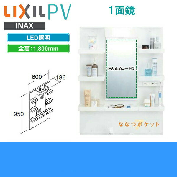 リクシル[LIXIL/INAX]PVミラーキャビネット MPV1-601YJ 1面鏡 LED照明 全高:1,800mm用 寸法:600x186x950mm トレイ7個、コンセント1個付 電源:プラグ式 ※直結式電源式仕様(納期約1週間)をご希望の場合は備考欄にてご連絡ください【-G直結式希望】INAX MPV1 601YJ