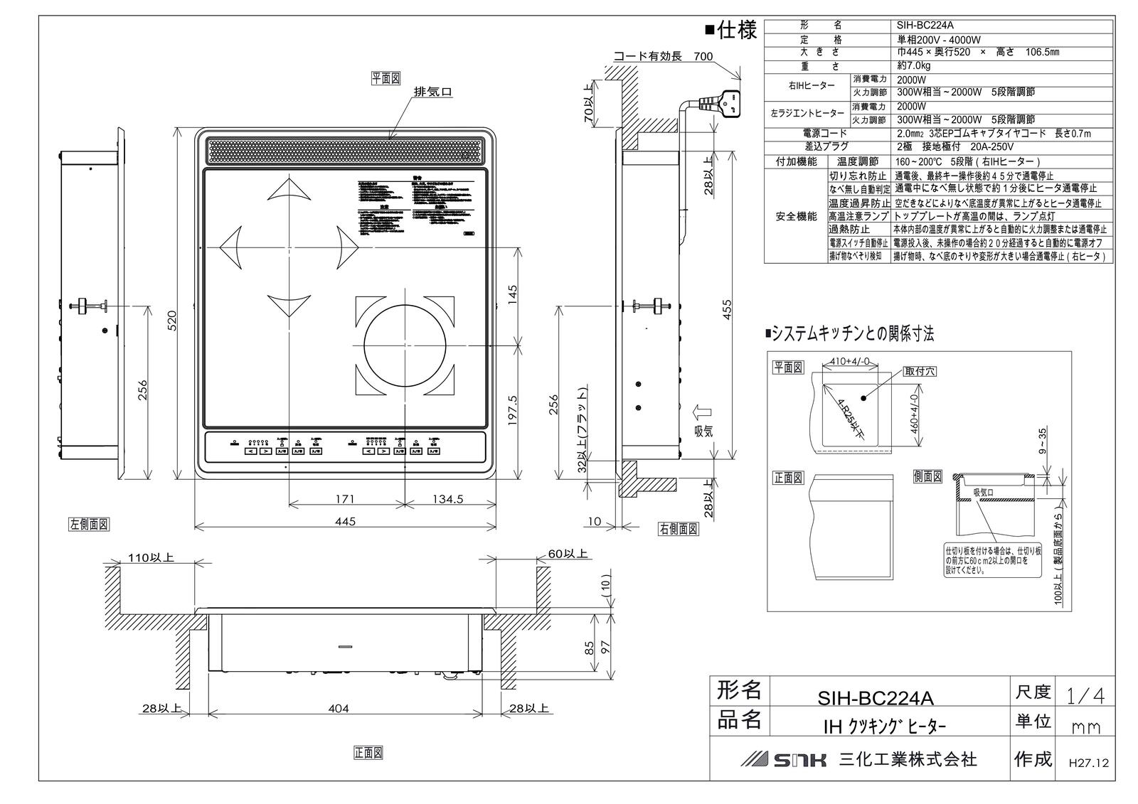 商品情報メーカー名三化工業サイズ幅445x奥行き520x高さ106.5(mm)重量約7.0kg右IHヒーター消費電力:2000W火力調節:300W相当〜2000W 5段階調節左ラジエントヒーター消費電力:2000W火力調節:300W相当〜2000W 5段階調節スペック[製品仕様]・仕様:ビルトイン2口コンロ 200V・カラー:ブラック・電源コード:3芯EPゴムキャブタイヤコード・長さ0.7m・差し込みプラグ:2極 接地極付20A・250V[安全機能]・なべ無し自動停止・揚げ物なべそり検知・切り忘れ防止・温度過昇防止(空焚き検知)・高温注意ランプ・電源スイッチ自動停止[付加機能]・温度調節:160〜200℃ 5段階(右IHヒーター)その他こちらの商品はメーカー直送につき代引き不可となります。IHクッキングヒーター 2口 200V 三化工業 SIH-BC224B ブラック【メーカー直送につき代引き不可】 コンパクトな薄型設計。実用性を追求したスクエアデザイン。IH×RHコンビネーションタイプのクッキングヒーターが、モデルチェンジしました。 ■洗練されたデザイン トップガラス、操作部をブラックに統一。 フレームをシルバーにすることで、 洗練された重厚感のあるデザインに。■便利なコンビネーションタイプ お鍋を選ばないコンビネーションタイプだから、 リフォームにも最適■充実の安全性+クリーン性 従来より大幅に薄型になり(29mm→10mm)、 清掃性がUPしました。 また安全機能も充実しています。 2