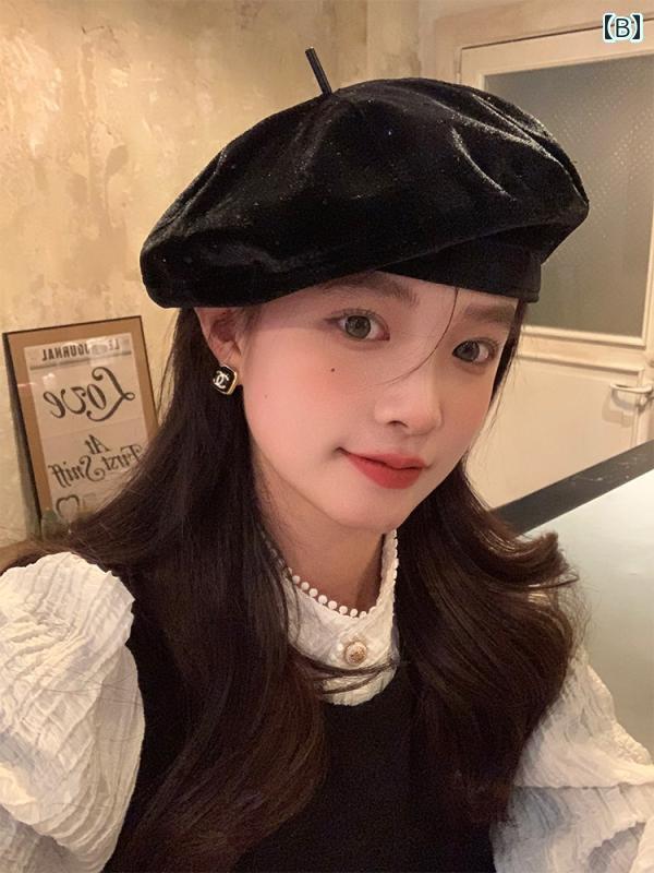 ベレー帽 レディース キラキラ 帽子 おしゃれ かわいい スイート リボン ベルベット 秋冬 ペインター ハット 黒