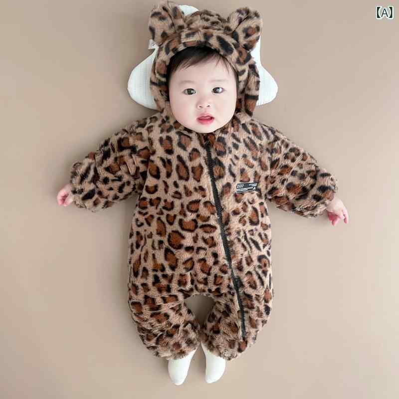 ロンパース ベビー 男女兼用 秋冬 厚手 もこもこ 裏起毛 フリース ヒョウ柄 総柄 フード付き カバーオール つなぎ ジップアップ あったか 防寒 部屋着 パジャマ おしゃれ 普段着 長袖