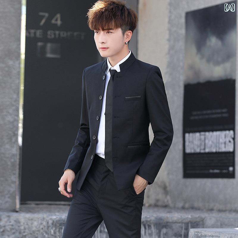 スーツ メンズ 男性用 スリムフィット 細身 スタンドカラー セットアップ 上下セット ジャケット パンツ 結婚式 ウェディング 披露宴 パーティー フォーマル ビジネス 通気性 シワになりにくい 上質素材 春秋 韓国風