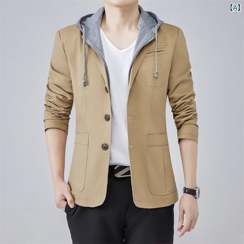 ・カテゴリ: カジュアルジャケット ・スタイル: ライトビジネス ・対象: 成人 ・性別: 男性 ・フィット: ストレート ・着丈: レギュラー ・袖丈: 長袖 ・ネックライン: テーラードカラー ・前合わせ: シングルブレスト3つボタン ・柄: 無地 ・デザイン詳細: ステッチ ・裾: スリットなし ・主な素材: スパンデックス70% ・裏地素材: 綿 ・お手入れ: 洗濯機洗い可 ・カラー展開: カーキ、ブラック ・サイズ展開: XS、S、M、L、XL、XXL