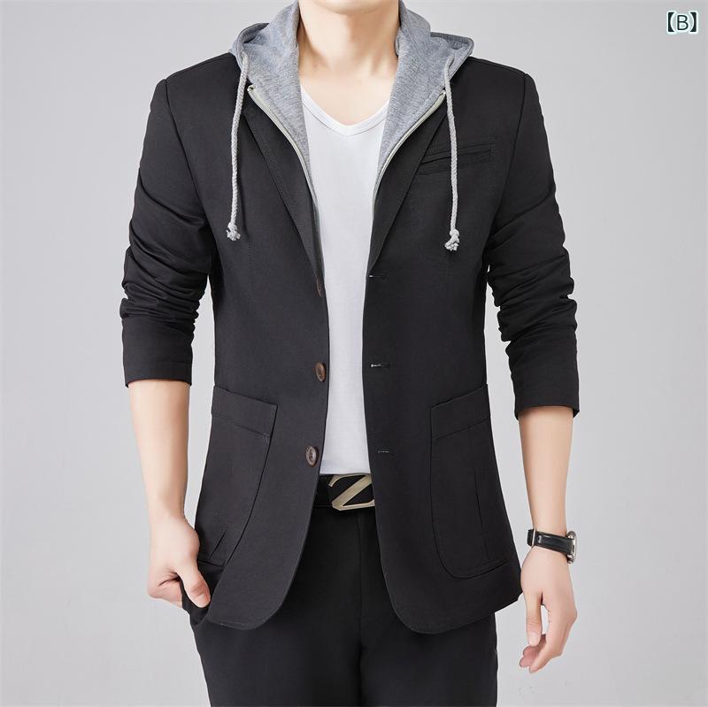 テーラードジャケット メンズ フェイクレイヤード フード付き 3つボタン 大きいサイズ ビッグシルエット ゆったり ストレートシルエット 春秋 軽ビジネス カジュアル ウォッシャブル コットン スパンデックス混 カーキ ブラック