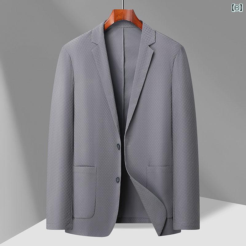 ・カテゴリ: カジュアルジャケット・スタイル: ベーシック・性別: メンズ・対象年齢層: 成人・主な素材: ナイロン83.2%・裏地素材: ポリエステル・ネックライン: テーラードカラー・フロント: シングルブレスト2つボタン・袖丈: 長袖・着丈: レギュラー丈・シルエット: ストレート・柄: 無地・機能: 通気性・着用シーン: デイリー・加工: 高温成型・デザインディテール: ステッチ・ポケット: 立体パッチポケット・裾デザイン: ストレート・カラー展開: ブラック、グレー・サイズ展開: 180, 185, 190, 195, 200, 205, 210, 215・サイズ区分: 大きいサイズ