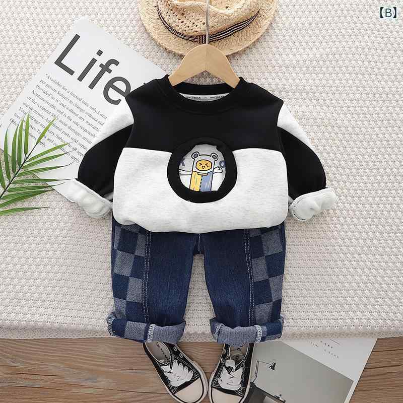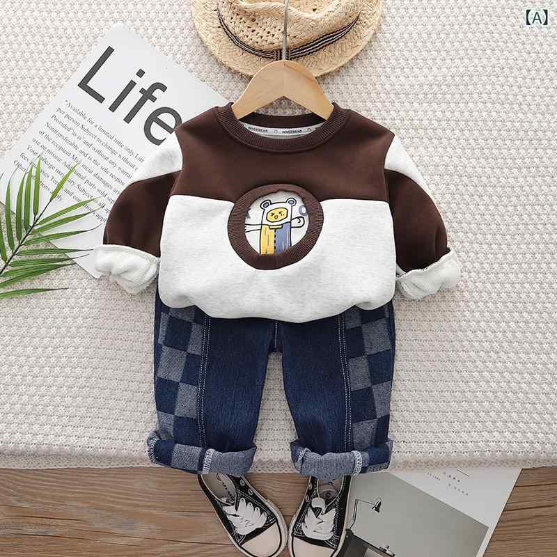 ・カテゴリ: キッズセットアップ・性別: 男・対象年齢: 1〜3歳 (身長80〜100cm)・スタイル: カジュアル・セットタイプ: パンツセット・セット内容: 2点セット・主な素材: 綿95%・袖丈: 長袖・パンツ丈: ロング丈・フード: なし・開閉スタイル: プルオーバー・厚さ: 裏起毛・柄: チェック、漫画、文字、抽象柄・要素: セット、チェック、漫画、文字、トレンド、股開き可能・生地加工: 柔らか加工・実物写真: モデルなし・カラー展開: ブラウン、ブラック・サイズ展開: 80cm、90cm、100cm、110cm、120cm・ギフトボックス内容: 服装