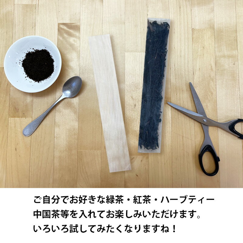 ※仕様変更につき商品が混在する場合がございます※ 平型ティーバッグ仕様変更のお知らせ※詳しくはこちらをご確認ください。 ご注意ください!こちらの商品は中身は入っておりません。 【 空袋 ロングティーバッグ タグ無し ソイロン紗フィルター 18cm 】になります。 生分解性によりつくられており、環境にやさしい商品です。 植物のデンプンを原料とした素材を使用している生分解性フィルターです。 透明感があり、中の茶葉も見えますので使い勝手も便利です。 サイズ  :約180mm×約30mm(機械による生産のため、繋ぎ目の若干のズレ、形やサイズに多少の誤差が生じる場合がございます。) 原料目安量:原料にもよりますが、緑茶 約8g程度を推奨しています。 ※こちらは『抽出用ティーバッグ』です。 煮出しでの使用は推奨しておりませんので、予めご了承ください。 なお、煮出し対応可能のティーバッグは下記からご検討ください。 煮出し対応可能 「 空袋 平型ティーバッグ タグ無し 紙 」シリーズはこちらから>> ※注意※ こちらの商品は生分解性により作られているため、熱シールの温度設定、またはお取り扱いが他の素材に比べて難しくなっております。 【使用方法】1.ティーバッグの1辺をはさみでカットします。2.ティーバッグの口を開け、茶葉を入れます。3.口をヒートシーラー機で封をします。4.完成。 ※ご自分での手作業ですので、市販物より見栄えが悪くなる場合もございますが、余分な綴じ代をハサミでカットする事により、自然な仕上がりに近くもなります。 ※こちらの商品(ソイロン紗フィルター)は、熱シールする際に130~140℃以上のヒートシーラー機が必要です! お手持ちのヒートシーラー機の温度設定のご確認をお願いいたします。 また、大変恐れ入りますが、当店ではヒートシーラー機の販売をしておりませんので、ご了承ください。 名称 空袋 ロングティーバッグ タグ無し ソイロン紗フィルター 18cm 内容量 100バッグ 保存方法 直射日光や高温多湿を避け、涼しい所で保管して下さい。 製造 静岡県静岡市ご自分でお好きな緑茶・紅茶・ハーブティー 中国茶などを入れてお楽しみいただける空袋のロングティーバッグです。 空袋 ロングティーバッグタグ無し 抽出用ソイロン紗 18cm 100バッグ
