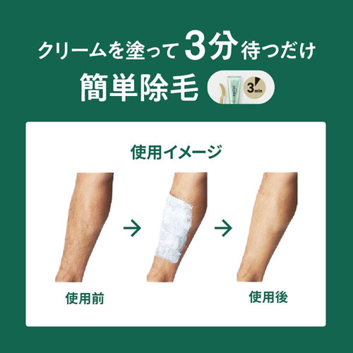 -------------------------------------------------------------- 画像はイメージです。 ※ PC環境により実際の色味や質感と異なって表示される場合がございます。 ※ 部品・パーツなどの一部の商品では本体の商品画像を使用しております。 ※ 製品の仕様・画像・パッケージは、メーカー側から予告なく変更される場合があります。 -------------------------------------------------------------- クリームを塗って3〜6分待つだけでムダ毛がキレイに取り除けます。 ●女性用除毛剤売上No.1ブランド「エピラット」の男性用除毛クリーム。●スピーディータイプ。■表示成分/全成分有効成分…チオグリコール酸その他の成分…ヒアルロン酸Na-2、フェノキシエタノール、セテアリルアルコール、パラフィン、水酸化Ca、POEラウリルエーテル、POEセチルエーテル、水酸化Na、海藻エキス-1、カモミラエキス-1、ハマメリス水、茶エキス-1、BG、香料、黄203、水■使用方法(1)添付のヘラにクリームを適量取り、除毛する部分に毛がかくれるくらいの厚さ(1〜3mm)にクリームをぬります。※毛の根元にクリームが行きわたらず、毛の途中からつけた場合は完全に除毛できませんのでご注意ください。※本品を皮フに強くすりこまないでください。(2)そのまま3〜6分程おき、添付のヘラやティッシュなどでこすらないようにクリームを取り除きます。除毛後は水かぬるま湯でよく洗い流してください。※洗い流す際、石けん類・ボディブラシなどは肌に刺激となりますので使用しないでください。(3)指定時間内に除毛しきれなかった場合は、それ以上放置せずに洗い流し、1日置いてからもう一度お使いください。■使用上の注意[使用前のご注意(ご使用前に必ずテスト使用してください)]お肌のトラブルを防ぎ、キレイに除毛するために必ずよく読んで正しくお使いください。あらかじめ除毛しようとする部位に本品を少量ぬり、約6分間放置し、赤味・はれ・かゆみ・強い刺激などの異常が生じた時は、使用しないでください。テスト後は水またはぬるま湯で洗い流してください。特にお肌の弱い方は、2日後(48時間後)のお肌に異常がないかを確認の上お使いください。下記の状態にある方は、皮フがデリケートになっていますのでご使用しないでください。(1)除毛する腕・足・わきの下に傷・はれもの・湿しん・ただれ・その他炎症のある方。(2)生理日の前後・産前産後および病中・病後の回復期など、身体に異常がある方。腕・足・わきの下のむだ毛以外には使用しないでください。顔面(眉・顔のむだ毛・男性のひげなど)・頭髪などの除毛には使えません。まつ毛や眉毛には使用しないでください。性器、肛門、粘膜には使用しないでください。目に入ると失明の恐れがあります。万一爪に付着した時はすぐに洗い流してください。ご使用前に石けん類・ボディブラシ・アルカリ性化粧水(ソフニングローションなど)・クリームなどを使用しないでください。[使用上のご注意](1)浴室でも使用できますが、換気のよいところでお使いください。(2)浴室でご使用の際、床がすべりやすくなるので注意してください。(3)湯船に入る際は、クリームを体から完全に洗い流してください。(4)使用中、赤味、はれ、かゆみ、刺激、色抜け(白班等)や黒ずみ等の異常が現れた時は、使用を中止し、皮フ科専門医等へのご相談をおすすめします。そのまま使用を続けると症状が悪化することがあります。(5)本品を皮フに強くすりこまないでください。(6)お肌に異常が生じていないかよく注意して使用してください。お肌に合わない時、また傷、湿しん等、異常のある時は使用しないでください。(7)かぶれなどの異常が生じた時は、かぶれ部分を手などでこすらないで、直ちに皮フ科専門医の診療を受けてください。ご自分の判断で薬などは、使用しないでください。(8)目に入った時は直ちに洗い流し、眼科専門医へのご相談をおすすめします。(9)クリームや洗浄液が性器や肛門、粘膜に付着しないように注意してください。万一付着した場合は、直ちに洗い流し、皮フ科専門医等へのご相談をおすすめします。(10)本品が衣服・床・じゅうたん・壁・家具・アクセサリーなどに付着しないよう、充分ご注意ください。万一付着した場合は、すぐに水ぶきまたは水洗いしたください。(11)本品を長時間浴室に置くと、中に水が入る場合がありますのでご注意ください。STOPお肌に合わない時は、直ちに使用を中止してください。メーカーの相談窓口または皮フ科専門医などへのご相談をおすすめします。[保管上のご注意](1)幼小児の手の届かないところに置いてください。(2)絶対に口に入れないでください。(3)高温や直射日光はさけて保管してください。(4)ヘラは水洗いして、水気をきってから保管してください。(5)チューブの口もとをきれいにふき、キャップをしっかり閉めて保管してください。■原産国日本 【発売元、製造元、輸入元又は販売元】クラシエ 商品区分:医薬部外品広告文責:ナチュラルウェブ株式会