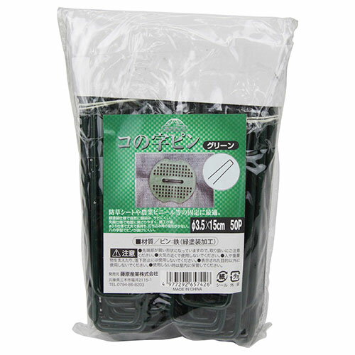 -------------------------------------------------------------- 画像はイメージです。 ※ PC環境により実際の色味や質感と異なって表示される場合がございます。 ※ 部品・パーツなどの一部の商品では本体の商品画像を使用しております。 ※ 製品の仕様・画像・パッケージは、メーカー側から予告なく変更される場合があります。 -------------------------------------------------------------- 防草シートやビニールマルチ等の固定で最適です。【用途】防草シートや農業ビニールなどの固定。【機能】線径3.5mm仕様で丈夫で長持ち打ち込み時の変形が少ないです。目立ちにくく、サビにくい緑塗装仕上げです。地面に刺さりやすく、施工がしやすい先端斜めカット仕様です。施工後、八の字にピンが開く為、ピンが抜けにくいです。ピン形状はコの字型なので、凹凸が少ないです。【仕様】形状:コの字型ピン長さ:15cmピン太さ:3.5mmピン肩幅:30mm入数:50本緑塗装仕様【材質】スチール【注意事項】先端部が鋭い形状になっていますので、取扱いにご注意ください。火気の近くで使用しないでください。使用しない時は屋内に保管してください。 【#177】