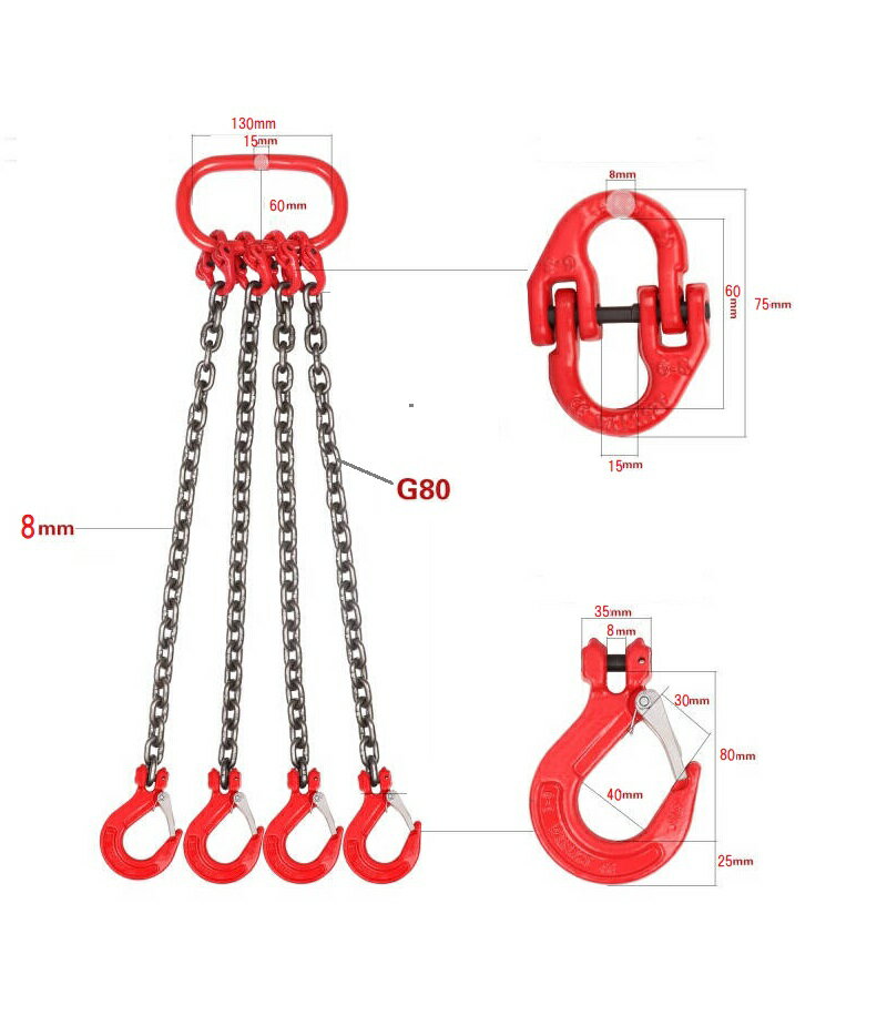 商品詳細 ●フックの開口寸法が広く玉掛け作業が楽です。 ●ロードチェーン採用でより安全になりました。(安全率4倍以上) ●過酷な使用条件にも強い特殊表面処理チェーンの採用で長寿命化を実現しました。 用途 ●荷役、運搬吊り作業。 ●吊り荷の玉掛け用具として。 仕様 ●基本使用荷重(t):2.4t(吊り角度60°) 3.36t(吊り角度45°) ●チェーン線径(mm):8 ●有効長l(m):1.5 ●マスターリンク寸法(mm)a:60 ●マスターリンク寸法(mm)b:130 ●スリングフック寸法(mm)c:15 材質 仕上 ●スチール ※生産物賠償責任保険付(PL保険) ■ご注意(免責)必ずお読み下さい 輸入品の為多少の傷・汚れはある場合がございます。 予告なく仕様が多少変更される場合がございます。 商品はモニターによって色合い等、実物と多少差異がある場合がございます。 商品使用の際に生じた、破損、怪我、損害などは一切責任・賠償等に応じることはできません。 【検索キーワード】 チェーンスリング 4本吊り 4本 スリングフックタイプ チェーンフック フック チェーン 吊りクランプ ベルトスリング 吊ベルト 吊り下げ 吊る 道具 グッズ 工具 グレード80ロードチェーン 荷物 運搬 玉掛け 吊り荷 倉庫 作業 巻きつけ DIY 4本チェーンスリング※ご使用の前に付属の取り扱い説明書を熟読し、 機器の知識・安全の情報そして注意事項について習熟してから正しくご使用ください。 ※商品改良のため、仕様・外観は予告なく変更する場合があります。 また実物は写真と異なる場合がありますので、あらかじめご了承ください。