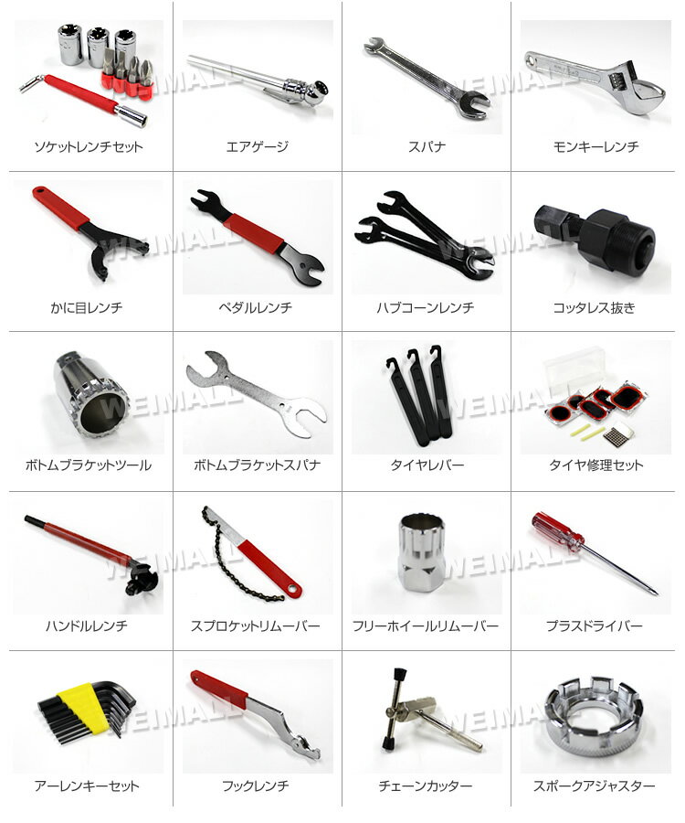 マウンテンバイクやロードバイクのメンテナンスに! MTBやロードバイク、自転車全般のメンテナイスに必要な基本的な工具が20種43パーツ入った工具セットです。 ベースセットとして必要な工具を厳選しました!! ステップアップごとに必要な工具を買い足していけば、あらゆるメンテに対応できます。 商品仕様 サイズ(約):33cm×26cm×7cm 商品内容 ソケットレンチセット:(8/9/10mm)/(ビットソケット)/(ビットPH+x2、−x2) エアゲージ かに目レンチ モンキーレンチ:〜18mm ペダルレンチ:15mm/16mm、15mm/17mm ハブコーンレンチ:13mm/15mm、14mm/16mm ボトムブラケットツール スパナ:8mm/10mm コッタレス抜き タイヤレバー ×3 ボトムブラケットスパナ:30mm/32mm、36mm/40mm タイヤ修理セット スプロケットリムーバー フリーホイールリムーバー ハンドルレンチ プラスドライバー アーレンキー(HEX)セット:1.5/2/2.5/3/4/5/6/8mm チェーンカッター(チェーン外し工具) スポークアジャスター:10/11/12/13/14/15G フックレンチ 注意事項 ・使用範囲内であっても、状態や状況によっては、使用することができない場合があります。 ▼検索ワード 自転車 工具セット 自転車工具セット 自転車工具 自転車修理工具セット 自転車修理工具 メンテナンス工具 メンテナンスツール サイクルツールセット 工具 整備 敬老の日 母の日 父の日 ギフト 誕生日 プレゼント 父の日ギフト 誕生日プレゼント 結婚祝い 福袋 メンズ レディース 男性 女性 あす楽 人気 おすすめ 送料無料 WEIMALL GARAGECOLLECTION